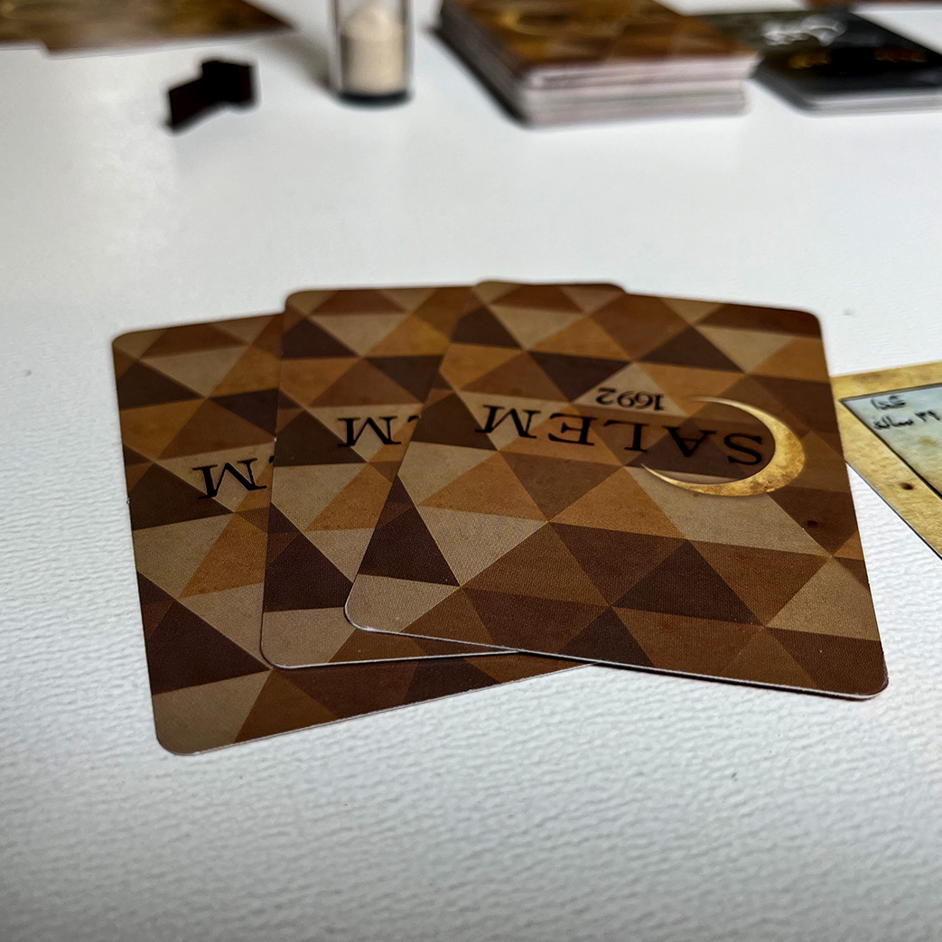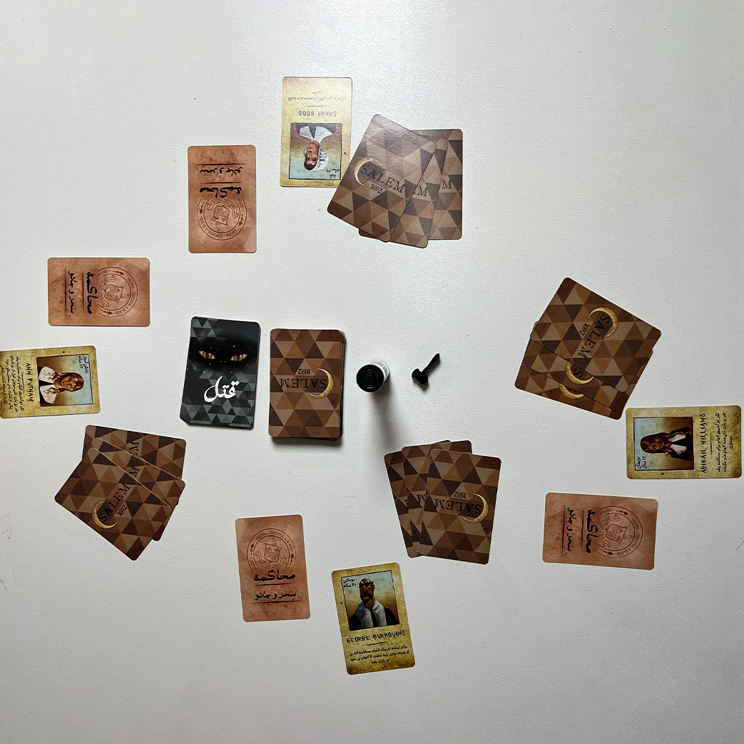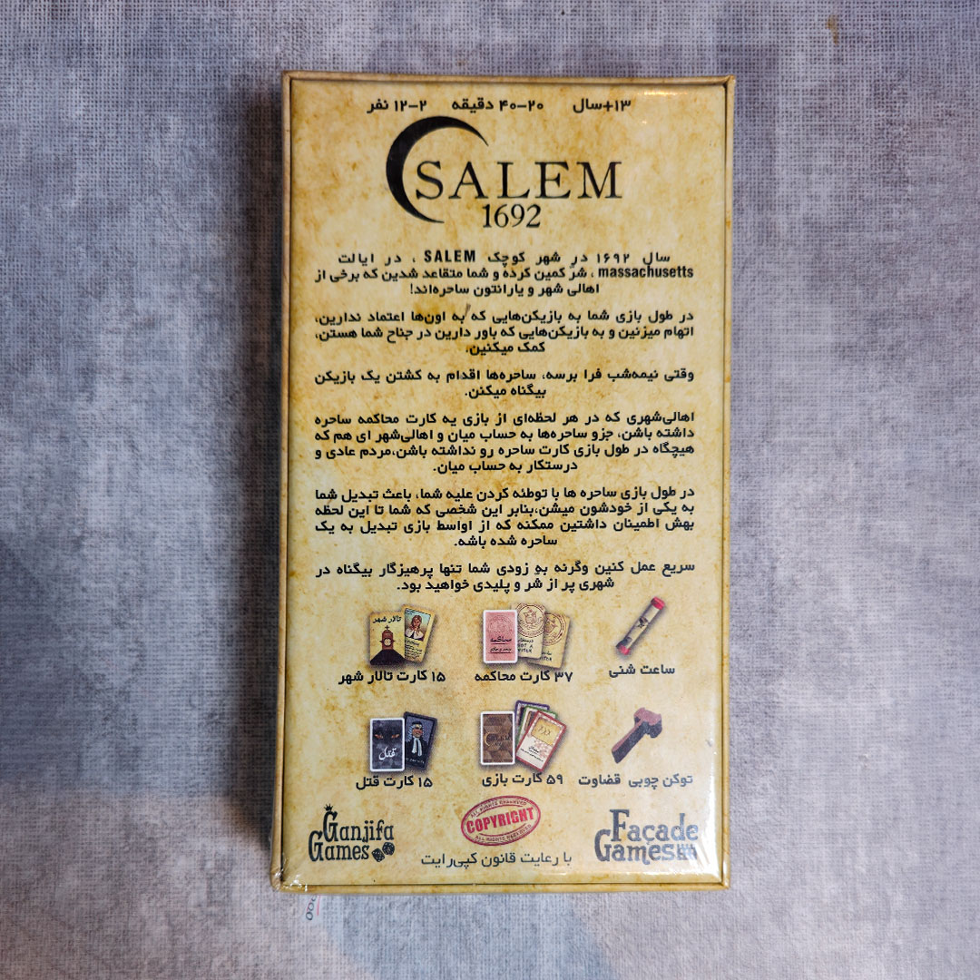 مروری بر جریان بازی: سال 1692 در شهر کوچک salem ، ایالت massachusetts ، شرّ کمین کرده و شما متقاعد شدین که برخی از اهالی شهر و یارانتون ساحرهاند! در طول بازی شما به بازیکنهایی که به اونها اعتماد ندارین، اتهام میزنین و به بازیکنهایی که باور دارین در جناح شما هستن، کمک میکنین. وقتی نیمهشب فرا برسه، ساحرهها اقدام به کشتن یک بازیکن بیگناه میکنن. اهالیشهری که در هر لحظهای از بازی یه کارت محاکمه ساحره داشته باشن، جزو ساحرهها به حساب میان و اهالیشهر ای هم که هیچگاه در طول بازی کارت ساحره رو نداشته باشن،مردم عادی و درستکار به حساب میان. در طول بازی ساحره ها با توطئه کردن علیه شما، باعث تبدیل شما به یکی از خودشون میشن،بنابر این شخصی که شما تا این لحظه بهش اطمینان داشتین ممکنه که از اواسط بازی تبدیل به یک ساحره شده باشه. سریع عمل کنین وگرنه به زودی شما تنها پرهیزگار بیگناه در شهری پر از شّر و پلیدی خواهید بود. محتویات: 15 تا کارت تالار شهر 15 تا کارت قتل 59 تا کارت بازی 37 تا کارت محاکمه ساعت شنی توکن چکش قضاوت با تجربهترین بازیکن بازی رو به عنوان جارچی انتخاب کنین. جارچی دستور باز و بسته کردن چشمها رو در طول راندهای نیمه شب میده. اگر تا به حال این بازی رو امتحان نکردین یا با تعداد بالا میخواین بازی کنین ،بهتون پیشنهاد میدیم که به جای جارچی،از یه فردِ خارج از بازی به عنوان گرداننده بازی استفاده کنین و یه نفر بدون اینکه خودش تو بازی باشه،گردوندن بازی رو براتون آسونتر کنه..
