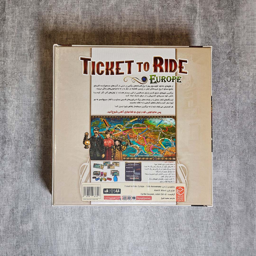 از طاقهاي باشکوه کولوسئوم روم تا برج افسانههاي بيگبن در لندن، از گنبدهاي مسحورکننده کليساي جامع مسکو تا برج حيرتانگيز ايفل در پاريس، قطارها بار ديگر ما را به ماجراجوييهاي زندگي ميبرند . بزرگترين شهرهاي دنياي قديم پذيراي مسافريني از قرن بيستم هستند . از تونلهاي آلپ گذر کرده و با دانش خود مسيرهاي کشتيراني را در درياي بالتيک ايجاد کنيد . ايستگاههاي قطار مجلل را در پايتختهاي بزرگ امپراتوريهاي قديمي بسازيد و با قطار سريعالسير به دور اروپا سفر کنيد و تمام بناهاي تاريخي را به نظاره بنشينيد . چمدان خود را ببنديد، شال و کلاه کنيد و آماده سفر شويد ! در بازي Ticket to Ride : Eroupe بازيکنان بايد در نقش تاجرين و سرمايهگذاران بزرگ اروپايي خطوط راهآهن را در سرتاسر اروپا گسترش دهند . هدف کلي در بازي بسيار ساده است، کارتهاي قطار را جمعآوري و بازي کنيد تا واگنهاي خود را روي صفحه بازي قرار دهيد، سعي کنيد شهرهاي مشخص شده روي کارتهاي بليط خود را به هم متصل کنيد . با تکميل هر مسير هم از قرار دادن واگنها و هم از تکميل بليط امتياز کسب ميکنيد اما بليط هاي تکميل نشده امتياز شما را از دست ميدهند . بازيکني که در پايان بازي بيشترين امتياز را داشته باشد برنده است .