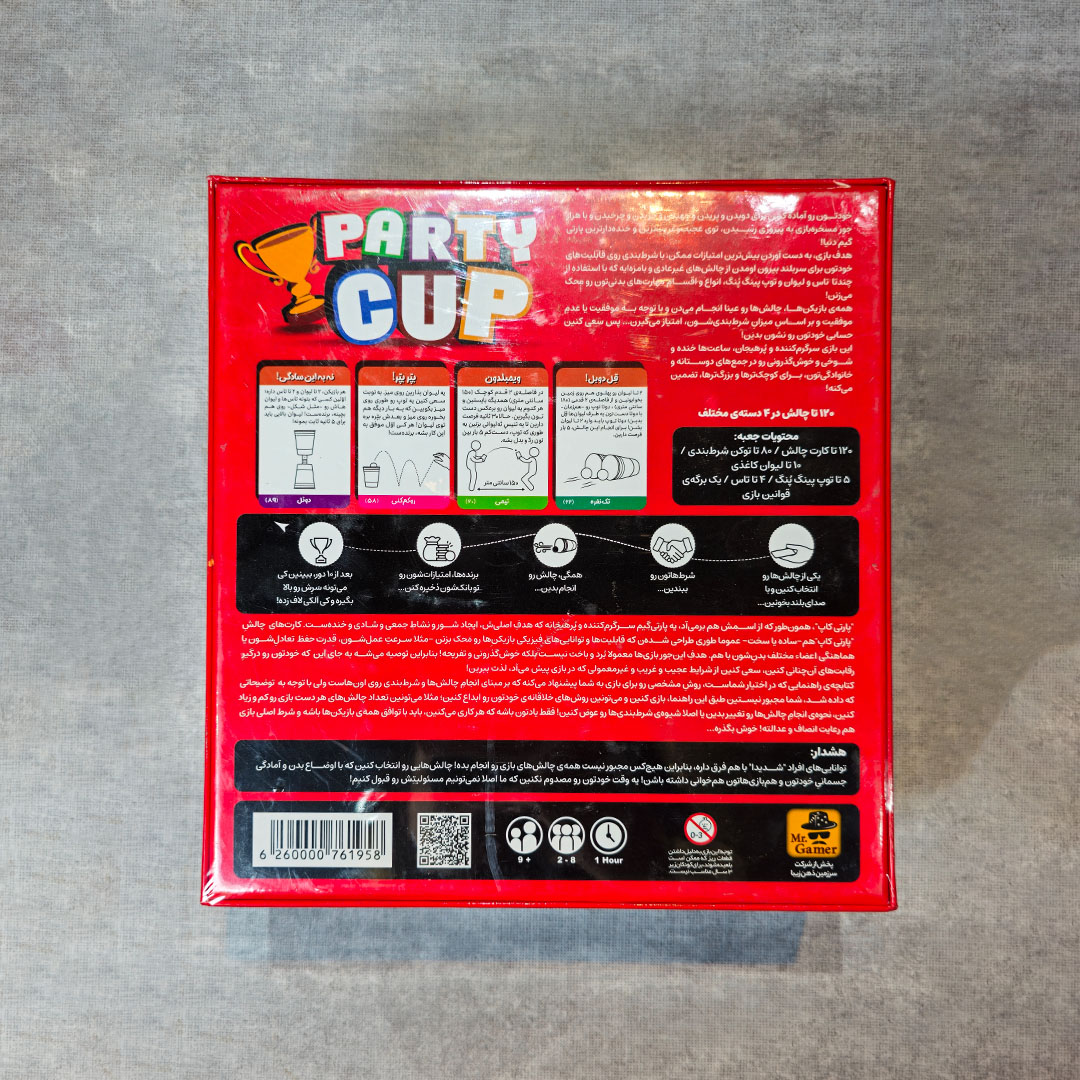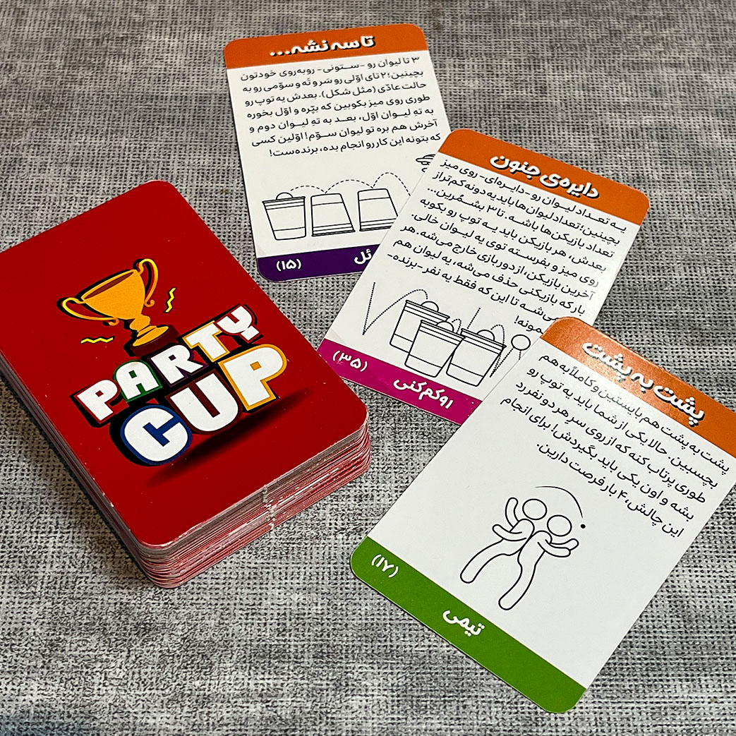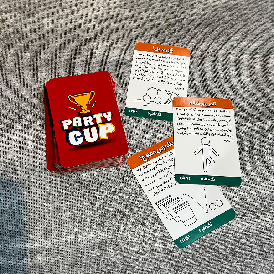 "پارتی کاپ" یه بازی جذّاب و پُرهیجانِه؛ پُر از چالشهای غیرِعادی و بانَمک و حتی شاید خندهداری که همزمان، مهارتهای بدنیِ شما و اعتمادبهنفسِتون رو مَحک میزنن! هر دست بازی، در 10 دور برگزار میشه و در هر دور، بازیکنها باید با یه چالشِ عجیب و غریب، دست و پنجه نرم کنن! قبل از انجامِ هر چالش، بازیکنها باید با استفاده از توکنهای مخصوص، روی موفقیت احتمالیِ خودشون شرطبندی کنن -که میتونه نشوندهندهی اعتمادبهنفس یا عدمِ اعتمادبهنفسِشون باشه! بعدش، همهی بازیکنها، چالش رو عیناً انجام میدن و با توجه به موفقیت یا عدمِ موفقیت و بر اساسِ میزانِ شرطبندیشون، امتیاز میگیرن! بازیکنی که در پایانِ چالش دهُم، بیشترین امتیازات رو کسب کرده باشه، برندهی بازیه!