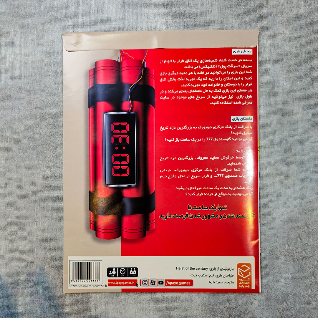 بسته در دست شما، شبیهسازی یک اتاق فرار با الهام از سریال «سرقت پول» (نتفلیکس) می باشد. شما این بازی را می توانید در خانه یا هر محیط دیگری بازی کنید و این امکان را دارید که یک تجربه لذت بخش اتاق فرار را با دوستان و خانواده خود تجربه کنید. هر معمای این بازی کمک به حل معماهای بعدی میکند و در طول بازی نیز میتوانید از سرنخ های موجود در سایت معرفی شده استفاده کنید.