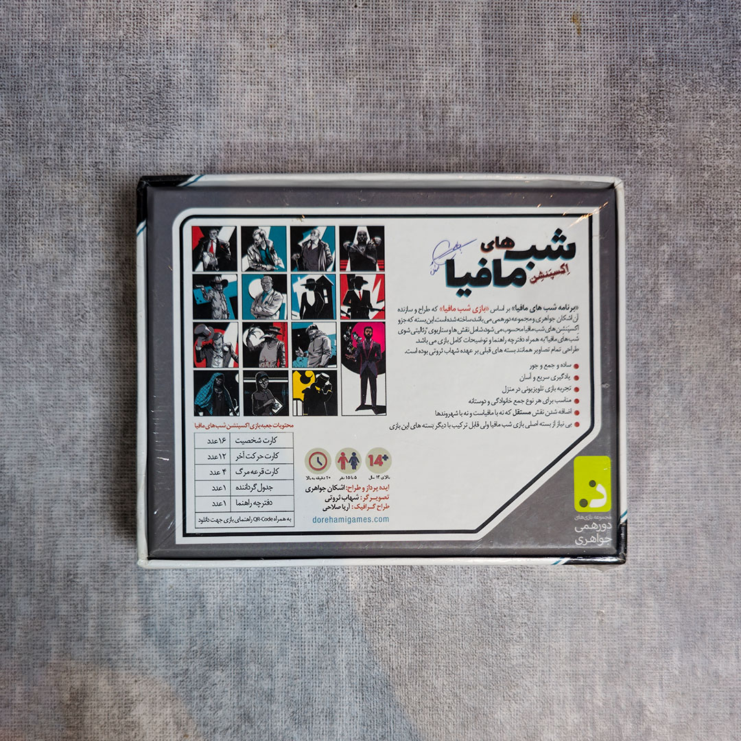 توضیحات بیشتر درخصوص “اِکسپنشِن تاریک” شب مافیا (اولین اِكسپَنشِن رومیزی ایران) وقتى صحبت از بسته اکِسپنشن میشه، اون هم در حوزه بازى، منظور بسته اى هست که به بازى اصلى اضافه میشه و بازى رو گسترده تر و باحالتر مى کنه. این اضافه شدن میتونه کارت، مهره، شخصیت نقشه،سناریو، داستان و قوانین بازى باشه. یعنى بسته اِکسپشِن به تنهایى قابل استفاده نیست و حتما باید به همراه بازى اصلى استفاده بشه. در واقع یه جور بروز رسانى و تغییر فصل بازى میشه. براى جایگزینى واژه اکسپنشن میشه از واژه هایى مانند افَزونه، بسته الحاقى یا بسته مکمل استفاده کرد اما چون این موضوع تخصصى است و اکِسپنشن اصطلاح رایج و عرف آن است، ما هم از همین واژه استفاد کردیم. در این بسته تاریک، شخصیت و کارت هاى جدید به بازى اضافه شدند ولى به این معنى نیست که بازى پیچیده تر یا سخت تر شده. فقط خواستیم حال و هواى تازه اى وارد بازى بشه و کمى بازى رو پخته تر کنیم تا دستتون در انتخاب شخصیت و ساخت سناریو هاى ابداعى بازتر بشه. کارت هاى جدید هم که اضافه شدند، هر کدام به بازیکنان قابلیت هاى خاص و تازه اى مى دهند و تعامل بین بازیکنان را بیشتر مى کنن. بسته اصلى شب مافیا طورى طراحى شده که در صورت لزوم، راحت مى تونین کارت هاى اکسپنشن را داخلش بذارین و به بازیتون اضافه کنین. اینجورى لازم نیست همیشه دو تا جعبه همراتون باشه. تمام شخصيت هاى بازى توسط مجموعه دورهمى طراحى شده است و به هيچ وجه كپى نيستند.