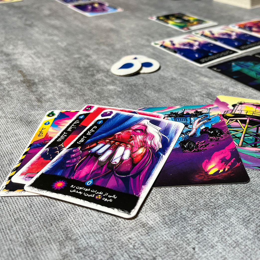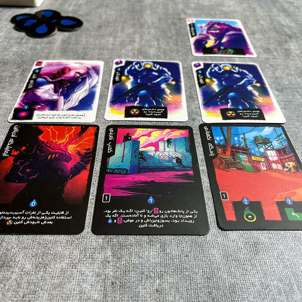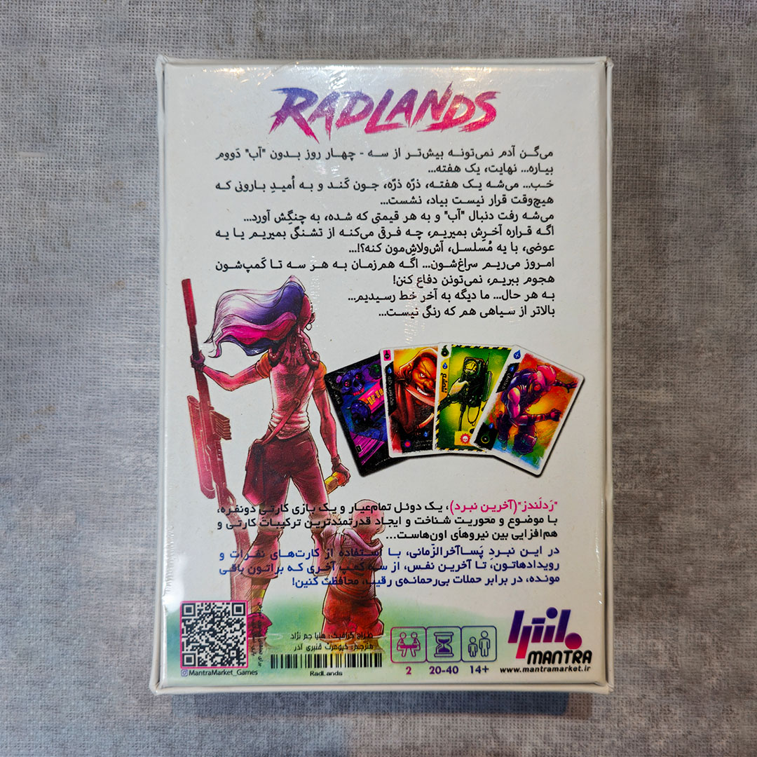 قبیلهی ما، "آب" داره... / و اونها دارن واسه گرفتنِش میآن... / خُب پس ما اوّل حمله میکنیم! ما فکر میکردیم اگه یه ضربهی محکم بهشون بزنیم... / اونها برمیگردن خونهشون! امّا دیگه خونهای در کار نیست...! نگاهی به بازی در "رَدلَندز" (Radlands)، هر بازیکن، مجموعهای از 3 "کَمپِ" مُنحصربهفرد رو تحویل میگیره و مسئولِ دفاع از اونها میشه؛ شما با "نابود کردنِ" همهی کمپهای حریفِتون، برندهی بازی میشین! عنصرِ اصلی و مایهی حیات در این بازی، "آب"ئه! با هزینه کردنِ توکنهای "آب"، میتونین کارتهای "نفر" و کارتهای "رویداد" رو بازی کنین (روی میزِ بازی بذارین) و از قابلیتهای کارتهایی که روی میز بازی دارین، بهرهمند بشین. "نفرات"، هم از کمپهای شما مُحافظت میکنن، هم میتونین از قابلیتهاشون استفاده کنین. "رویدادها"، تأثیراتِ مهم و ارزشمندی هستن که برای اِعمال شدنشون در بازی، به زمان نیاز دارین! هر دو بازیکن، از یک "دِک" (دسته کارت) کارت میکشن. کارتها رو، هم میشه بازی کرد (روی میز گذاشت)، هم میشه سوزوند و بلافاصله تأثیرِ "سوختن"شون رو اِعمال کرد. اگه میخواین برنده بشین، باید از کارتها و توکنهای آبتون کاملاً هوشمندانه استفاده کنین!