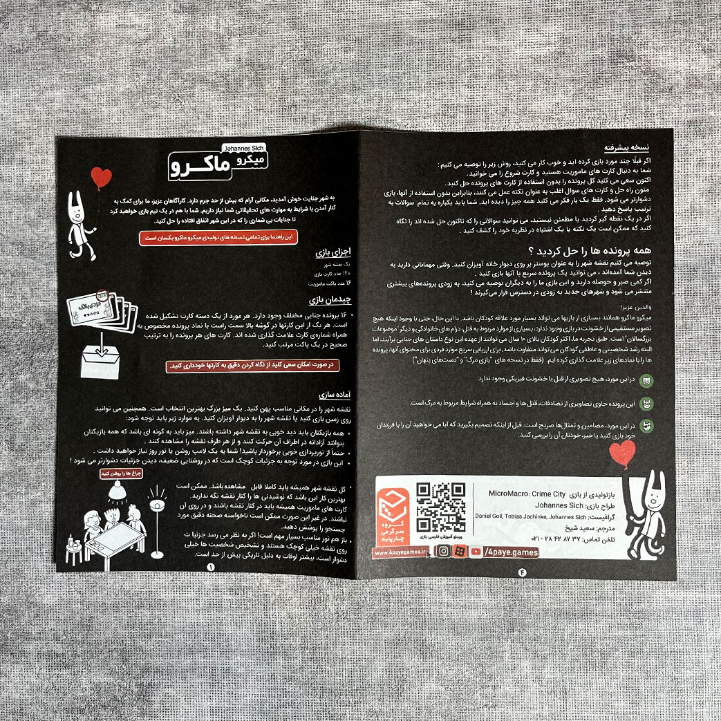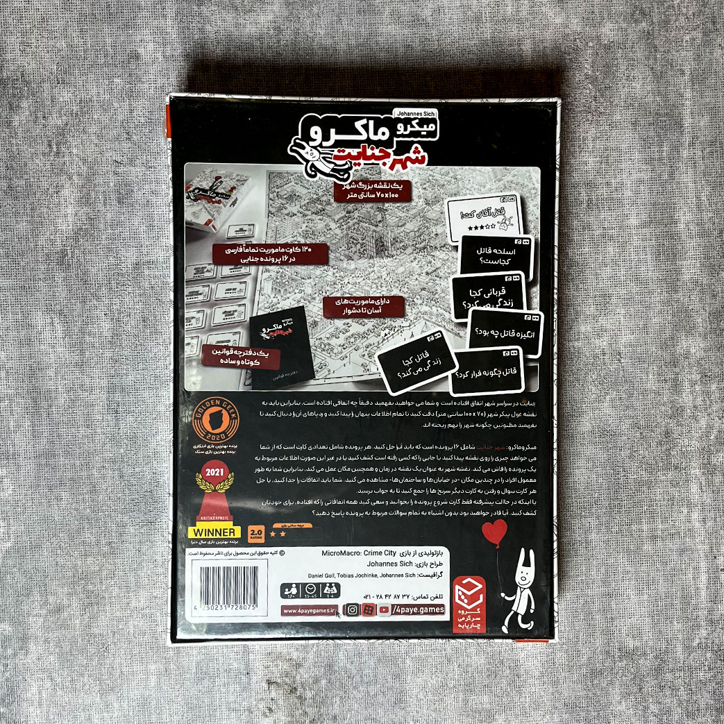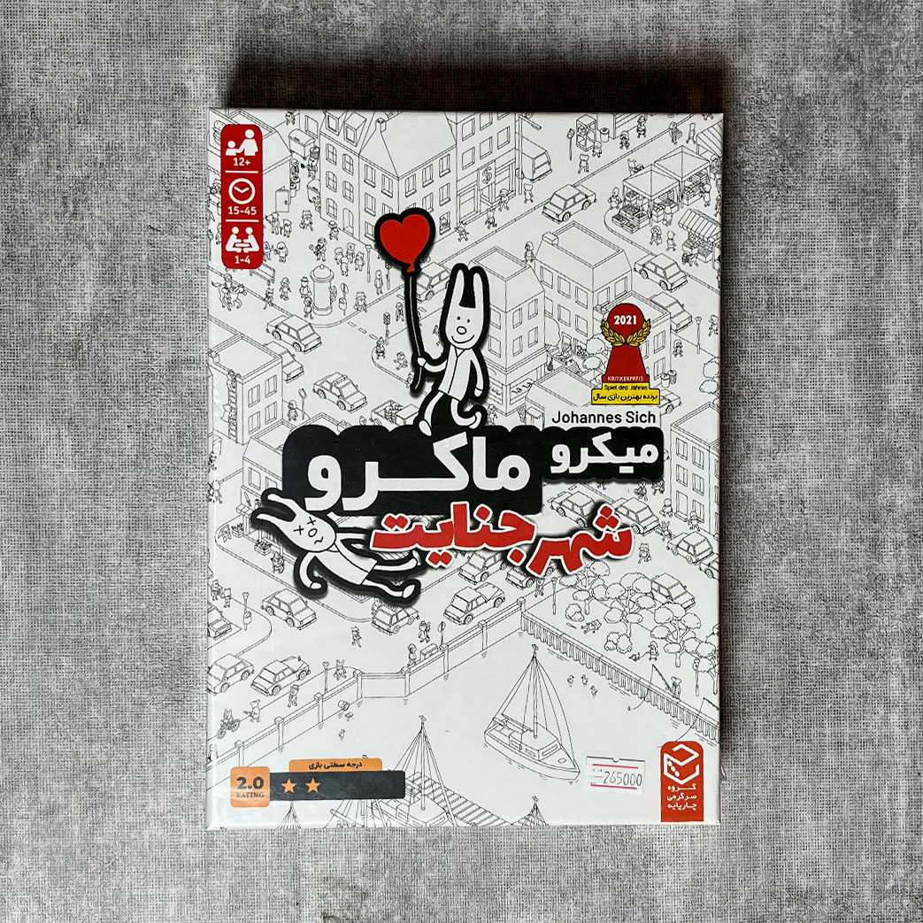 بازی میکرو ماکرو MicroMacro: crime city سرنخ های کوچک را برای حل پرونده های بزرگ پیدا کنید. تعداد نفرات: 1 تا 4 نفر زمان بازی: حدود 15 الی 45 دقیقه مناسب برای بازیکنان بالای 12 سال محصول گروه : چارپایه طراح بازی : Johannes Sich برنده جایزه بهترین بازی سال دنیا در سال 2021 15 نامزدی در جوایز جهانی و برنده 5 جایزه جهانی