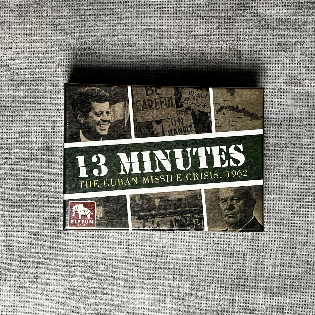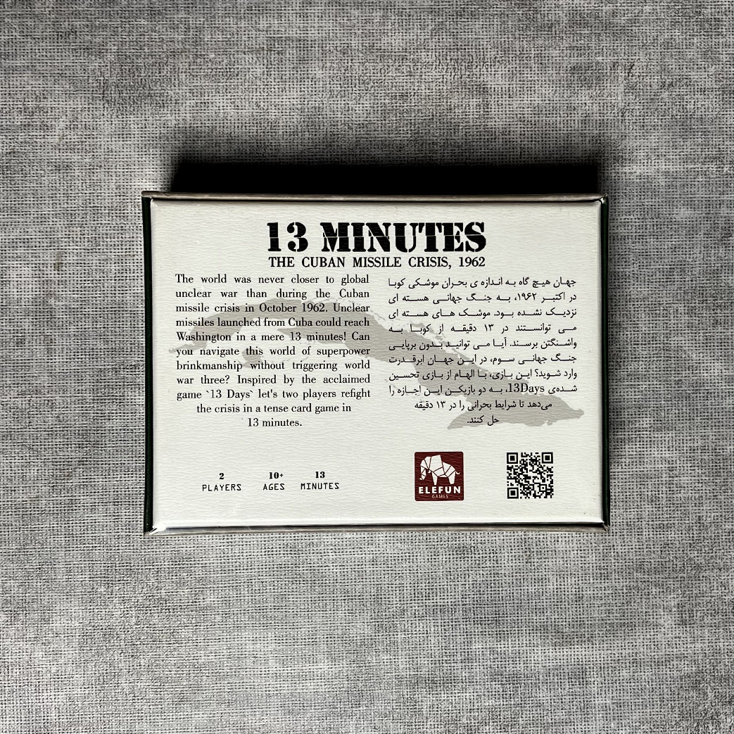 نسخه ایرانی بازی خارجی 13Minutes: The Cuban Missile Crisis, 1962 یک بازی استراتژیک و دو نفره جنگ سرد در 13 دقیقه تعداد بازیکنان: 2 نفر زمان بازی: حدود 13 دقیقه مناسب برای بازیکنان بالای 10 سال تولید کننده: Elefun games طراحان بازی : Asger Harding Granerud, Daniel Skjold Pedersen جهان هیچ گاه به اندازه بحران موشکی کوبا در اکتبر ۱۹۶۲ به جنگ جهانی هسته ای نزدیک نشده بود . موشک های هسته ای می توانستند در ۱۳ دقیقه از کوبا به واشنگتن برسند . ایا می توانید بدون برپایی جنگ جهانی سوم در این جهان ابر قدرت وارد شوید؟ ۱۳دقیقه طراحی شده توسط ASGER HARDING GRANERUD و DANIEL SKJOLD محتویات جعبه: ۱۳ کارت ۲۶ مهره ۱۳ تا قرمز و ۱۳ تا آبی دفترچه قوانین داستان بازی بحران کوبا ، ۱۳ دقیقه ، بازی کارت محور است که در آن شما باید تصمیمات سختی بگیرید. بازیکن ها به عنوان رئیس جمهور کندی یا خروش چف در بازی هستند. هدف شما خارج شدن از این بحران با نهایت قدرت ممکن است. در طول بازی ۵ کارت بازی خواهید کرد و اینگونه بازی را پیش میبرید ، این کارت ها به شما اجازه می دهند تا از مکعب های نفوذ خود استفاده کنید و از کارت ها امتیاز بگیرید. مراقب تصمیمات خود باشید، چون تصمیمات اشتباه میتواند موجب شکل گیری جنگ جهانی هسته ای شود. چیدمان بازی ا . بازیکن ایالات متحده ۱۳ مکعب آبی و بازیکن شوروی ۱۳ مکعب قرمز را دریافت می کنند. ۲.دسته کارت ها را بر زده به هر بازیکن ۲ کارت بدهید و سپس یک کارت و را به پشت در وسط میز به عنوان عنوان زمین کوبا قرار دهید. زمین بازی از ۳ قسمت تشکیل شده است : ۱.منطقه امن است که در وسط قرار دارد. (منطقه بی طرف) ۲.دو منطقه دیگر که در مقابل هر بازیکن قرار دارد، اهمیت بسیاری در بازی دارند زیرا در حالتی که کارت تحت کنترل کسی نیست اگر در منطقه شما باشد امتیاز برای شما می شود. روش انجام بازی ا.انتخاب شروع کننده با مزایده برای انتخاب شروع کننده هر بازیکن از تمام مکعب های خود هر تعدادی که میخواهد را برداشته و در مشت خود نگه می دارد. سپس بازیکنها به صورت همزمان مکعب های خود را رو میکنند در صورت تساوی مکعب ها ،مکعب های هر دو بازیکن به دست آنها بر می گردد و دوباره این کار را انجام میدهند و در صورت بیشتر بودن مکعب های یکی از بازیکنها آن بازیکن تصمیم می گیرد که چه کسی بازی را شروع کند. مکعب هایی که در مشت هر دو بازیکن بوده از بازی خارج میشوند. ۲.نوبت بازی بازیکن ها در نوبت خود یک کارت از دو کارت دست خود را بازی کرده و در انتهای نوبت یک کارت از دسته کارت ها بر می دارند. زمانی که هر بازیکن تنها یک کارت در دست خود داشته باشد و دسته کارتها تمام شده باشد. بازی به اتمام می رسد. کارت ها به ۳ دسته تقسیم میشوند کارت های آمریکا کارت های شوروی و کارت های بی طرف شما می توانید کارتی را که بازی میکنید در یکی از دو منطقه قرار دهید ، منطقه اول جلوی خودتان است یا منطقه دوم که در وسط میز است. ۲ نوع قابلیت با بازی کردن کارت ها ممکن است اتفاق بیفتد که بازیکنها اجازه دارند یکی از آنها را انتخاب کنند. نوع اول شما میتوانید با توجه به تعداد مکعب های بالای کارتتان مکعب گذاشته یا مکعب بردارید. در صورت گذاشتن مکعب روی کارت آن کارت را یک منطقه به ست خود نزدیک کنید و یا در صورت برداشتن مکعب از روی کارت کارت را یک منطقه به سمت حریفتان ببرید (با هر تعداد مکعب کارت یک خانه جابه جا می شود.) مكعب ها نشان دهنده ی میزان قدرت نفوذ شما بر آن کارت هستند. پایان بازی : ۱.رخ دادن جنگ هسته ای ۲.تمام شدن کارت ها و امتیاز شماری