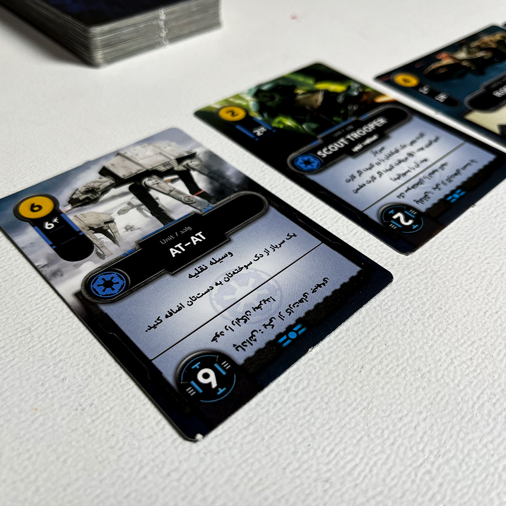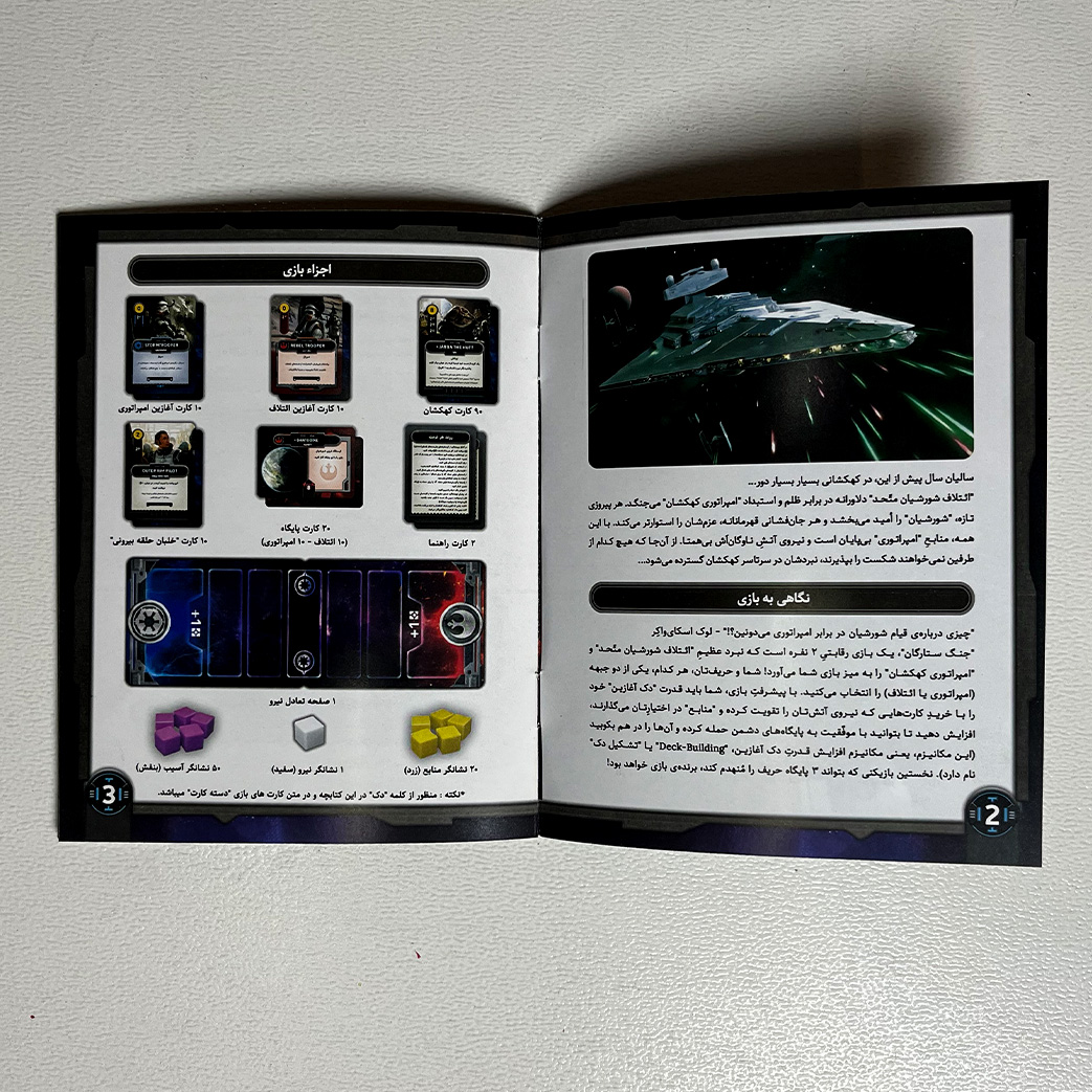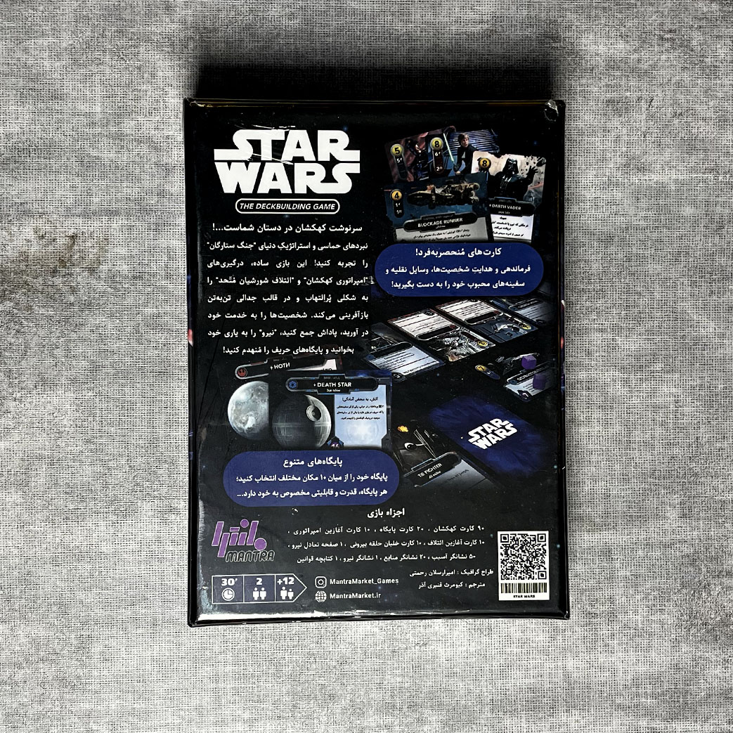 بازی جنگ ستارگان: دک بیلدینگ نسخه ایرانی بازی خارجی Star Wars: The Deckbuilding Game یک بازی کارتی و دونفره فوق العاده جذاب مقابله و جنگ تمام عیار سفینه های فضایی و امپراتوری کهکشان نبرد عظیمِ "ائتلاف شورشیان متّحد" و "امپراتوری کهکشان" کیفیت بالای ساخت یکی از بهترین بازی های یا مکانیزم Deck-Buildin تشکیل دک طراحی تصویری زیبا و توضیحات جذاب درباره کارت ها تعداد نفرات: 2 زمان بازی: حدود 30 دقیقه تولید گروه مانترا بازی ایرانی جنگ ستارگان Star Wars: The Deckbuilding Game سالیان سال پیش از این، در کهکشانی بسیار بسیار دور... "ائتلاف شورشیان متّحد" دلاورانه در برابر ظلم و استبداد "امپراتوری کهکشان" میجنگد. هر پیروزی تازه، "شورشیان" را اُمید میبخشد و هر جانفشانی قهرمانانه، عزمشان را استوارتر میکند. با اینهمه، منابعِ "امپراتوری" بیپایان است و نیروی آتشِ ناوگاناَش بیهمتا. از آنجا که هیچ کدام از طرفین نمیخواهند شکست را بپذیرند، نبردشان در سرتاسر کهکشان گسترده میشود... نگاهی به بازی "چیزی دربارهی قیام شورشیان در برابر امپراتوری میدونین؟!" - لوک اسکایواکِر "جنگ ستارگان"، یک بازی رقابتیِ 2 نفره است که نبرد عظیمِ "ائتلاف شورشیان متّحد" و "امپراتوری کهکشان" را به میز بازی شما میآورد! شما و حریفتان، هر کدام، یکی از دو جبهه (امپراتوری یا ائتلاف) را انتخاب میکنید. با پیشرفتِ بازی، شما باید قدرت "دک آغازین" خود را با خریدِ کارتهایی که نیروی آتشتان را تقویت کرده و "منابع" در اختیارِتان میگذارند، افزایش دهید تا بتوانید با موفّقیت به پایگاههای دشمن حمله کرده و آنها را در هم بکوبید (این مکانیزم، یعنی مکانیزم افزایش قدرتِ دک آغازین، "Deck-Building" یا "تشکیل دک" نام دارد). نخستین بازیکنی که بتواند 3 پایگاه حریف را مُنهدم کند، برندهی بازی خواهد بود! محتویات بازی جنگ ستارگان : *90 عدد کارت کهکشان *20 عدد کارت پایگاه *10 عدد کارت آغازین ائتلاف *10 عدد کارت آغازین امپراتوری *10 عدد کارت خلبان حلقه بیرونی *2 عدد کارت راهنما *50 عدد نشانگر آسیب (مکعب بنفش) *20 عدد نشانگر منابع ( مکعب زرد) *یک عدد نشانگر صفحه تعادل نیرو (مکعب سفید) *یک عدد صفحه تعادل نیرو *یک عدد دفترچه راهنمای بازی *نکته : منظور از کلمه "دک" در این کتابچه و در متن کارت های بازی "دسته کارت" میباشد. "من از شش سالگی واردِ این جنگ شدهم!" - کاسیَن آندور "جنگ ستارگان"، نبردی است بین دو جبهه: امپراتوری و ائتلاف شورشیان. هر کدام از جبههها، شخصیتها، وسایل نقلیه، سفینهها و پایگاههای مخصوص خودشان را دارند که به هر کدام، تِم و روش بازیِ "جنگ ستارگانیِ" خاصّی میدهد! علاوه بر این، کارتهای بیطرف هم هستند که نشانگرِ سفینهها، وسایل نقلیه و شخصیتهاییاَند که بَدِشان نمیآید به یکی از دو جبهه بپیوندند... البته در اِزای پول! کارتهای دک کهکشان، به سه دستهی مشخّصِ امپراتوری، ائتلاف و بیطرف تقسیم میشوند. فقط بازیکن امپراتوری میتواند کارتهای امپراتوری را بخرد و فقط بازیکن ائتلاف میتواند کارتهای ائتلاف را بخرد. هر دو بازیکن میتوانند کارتهای بیطرف را بخرند. کارتی که به جبههی حریفِ شما تعلّق دارد، یک کارت دشمن است. ((نماد امپراتوری / نماد ائتلاف شورشیان)) ((اینها، نمادهای دو جبههی بازی هستند. کارتی که هیچکدام از این نمادها را در خود نداشته باشد، یک کارت بیطرف است.)) روش بازی "تازه از اینجا جالب میشه!" - آناکین اسکایواکِر بازی به شکل یک سلسلهنوبت انجام میشود. امپراتوری، نخستین نوبت را بازی میکند؛ سپس نوبت به شورشیان میرسد و بازی همینطور نوبت به نوبت پیش میرود تا این که یکی از دو طرف، سه پایگاه دشمن را مُنهدم کرده و پیروز شود. آغازِ نوبت این رَوند، در آغاز هر نوبت، انجام میگیرد: ابتدا، اگر پایگاهی ندارید (چرا که حریف، در نوبت قبلی، پایگاه شما را مُنهدم کرده)، نگاهی به کارتهای پایگاه باقیماندهتان بیندازید و یکی را به عنوان پایگاه جدید خود انتخاب کنید. بعد، اگر نشانگر نیرو در صفحهی تعادل، در نزدیکترین خانهی سمتِ شما قرار دارد، یک منبع دریافت کنید -