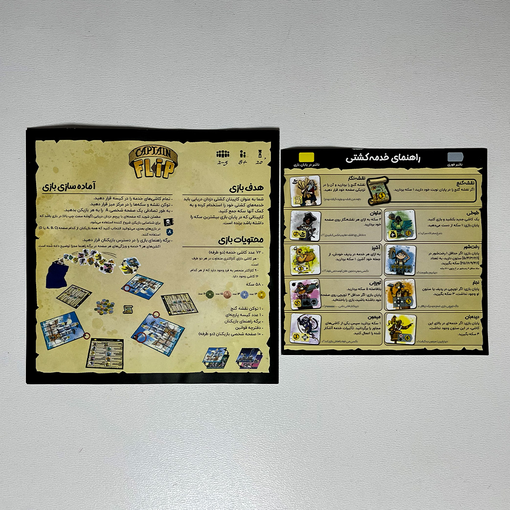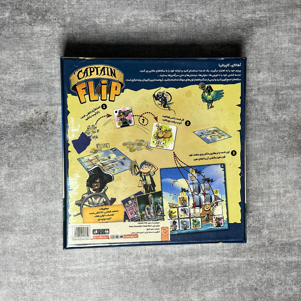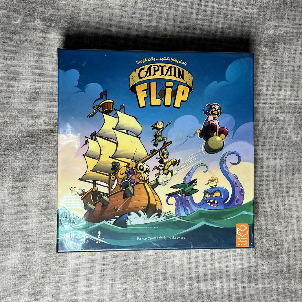 آهاااای، کاپیتان! پرچم خود را به اهتزاز درآورید، یک خدمه استخدام کنید و خزانه خود را با سکه های طلایی پر کنید. خدمه کشتی خود را با توپچیها، ملوانها، دیدهبان ها و حتی سرآشپزها بسازید... سکه ها را جمع آوری کنید و ترسی از جنگ و انفجار توپهای مهلک نداشته باشید. ثروتمندترین کاپیتان برنده بازی است. کاپیتان فلیپ یک بازی با قوانین ساده است که در زمان کمتری نسبت به شلیک گلوله توپ توضیح داده شده است. در نوبت خود، یک کاشی از کیسه بکشید. شما آن را دوست دارید؟ نگهش دارید و اگر شما آن را دوست ندارید، به پشت برگردانید! سپس آن را روی صفحه خود قرار دهید تا خدمه خود را تشکیل دهید. ۱. تصادفا یک کاشی خدمه را از کیسه بکشید! ۲.اگر خدمه را نمیخواهید، آنرا به پشت بچرخانید! ۳. این خدمه را در بهترین نقطه روی صفحه خود قرار دهید و اکشن آنرا انجام دهید! محتویات: ۱۰ صفحه شخصی ۷۲ کاشی خدمه ۵۶ سکه ۱ توکن نقشه ۱ کیسه پارچه ای