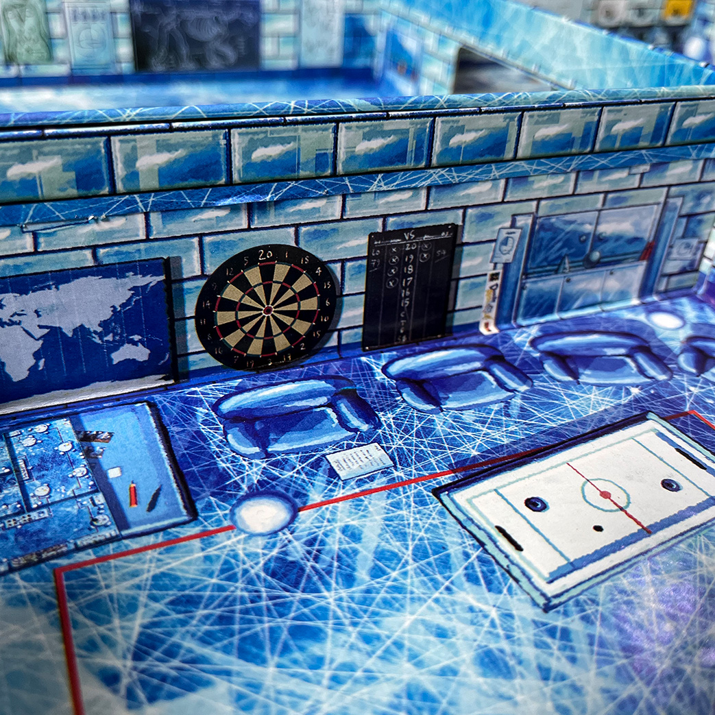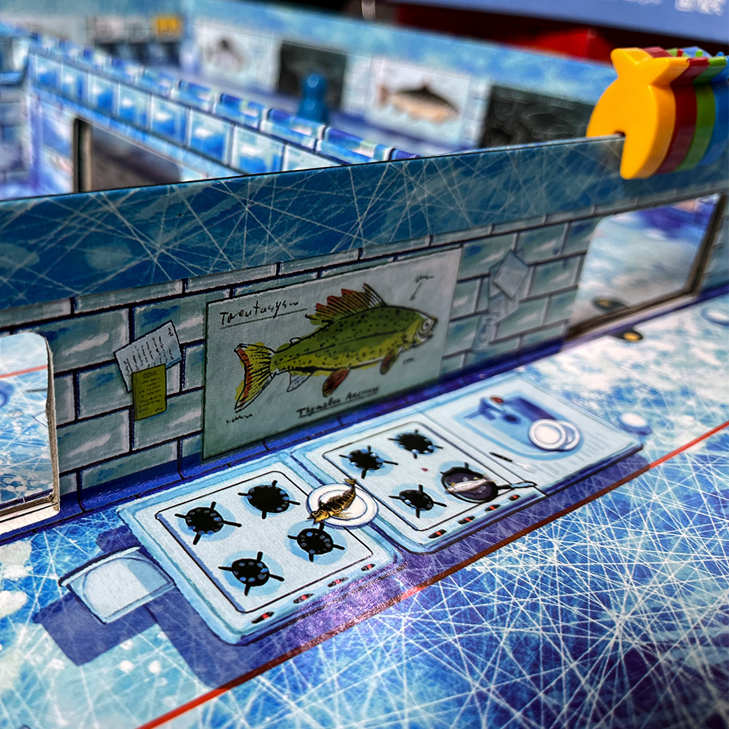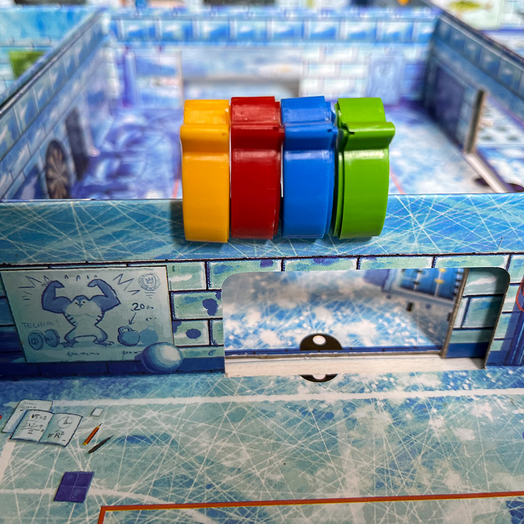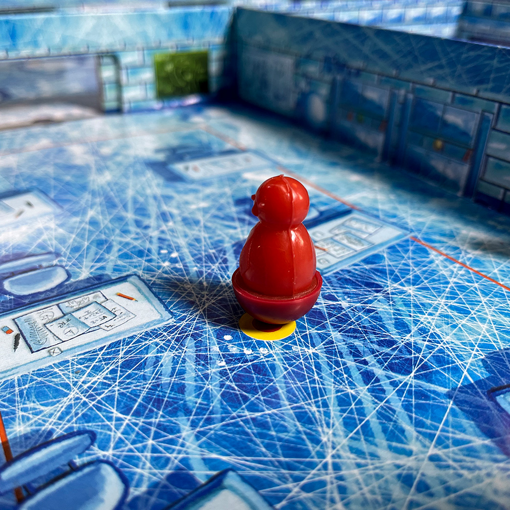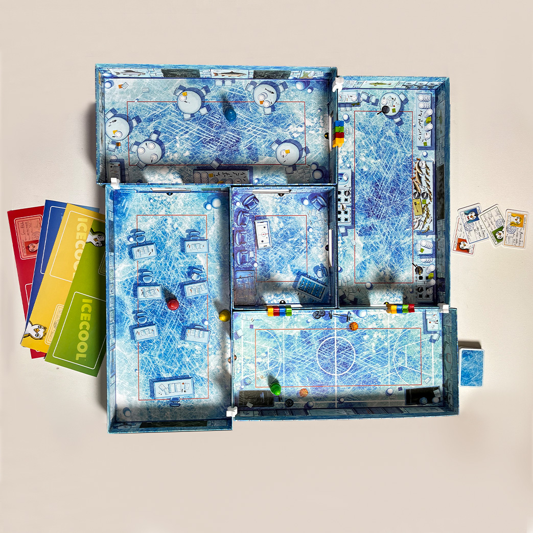 به زمان استراحت نهار نزدیک میشویم، و پنگوئنهای نوجوان بالاخره به ماهیهایی که برای خوردنشان اشتیاق داشتند، خواهند رسید. اما، تعدادی پنگوئن خرابکار وجود دارد که سعی میکنند پیش از شروع ساعت نهار، ماهیها را بدزدند؛ ولی آنها یک چیز را فراموش کردهاند - مبصر مدرسه! در هر روز یکی پنگوئن به عنوان مبصر انتخاب شده، تا حواسش به مدرسه باشد. اکنون، تمام نگاهها به او بوده، و زمان، زمان. درخشش او است - برای دستگیر کردن هر پنگوئن خرابکار، به او ماهی اضافه داده میشود. به این ترتیب، مسابقهی هیجانانگیزی شکل میگیرد - خرابکارها از این اتاق به آن اتاق رفته، و برای دزدی به دنبال ماهی میگردند؛ اما مبصر مدرسه در تلاش برای دستگیری آنها است، تا نظم را به مدرسه برگرداند. کدام یک موفق خواهند بود؟! بازی رومیزی ICECOOL، یک بازی سبک ضربه زدن است، که در آن یکی از بازیکنان در نقش مبصر مدرسه (یا دستگیرکننده، Catcher) و دیگران در نقش خرابکارها (یا فراریها، Runner) با یکدیگر رقابت میکنند. مبصر در تلاش برای دستگیری خرابکارهاست تا امتیاز کسب کند. خرابکارها نیز در تلاش برای فرار از دست مبصر و دزدیدن ماهی هستند، تا امتیاز کسب کنند. هرگاه مبصر مدرسه هر کدام از خرابکارها را حداقل یکبار دستگیر کند، یا یکی از خرابکارها از هر سه دری که داخل اتاقشان ماهی است، عبور کند، یک دور بازی به پایان میرسد. هر کدام از بازیکنان یک بار مبصر شده، و در پایان، بازیکنی که بیشترین امتیاز را روی کارتهای ماهی خود داشته باشد، برندهی بازی خواهد بود. پنگوئنها را میتوان با ضربه زدن، به یک مسیر مستقیم هدایت کرد، یا حرکت قوسیشکل به آنها داد، و یا حتی از روی دیوارها پراند! بازیکنان باید هرچه در توان دارند، و به ذهنشان میرسد را به کار گیرند، تا در این بازی جذاب و پرهیجان، بیشترین امتیاز را کسب کنند. این بازی فقط Cool نیست؛ ICE COOL است! بوردگیم آیسکول از بازیهای سبک خانوادگی (Family) و کودکانه (Children) است. از جمله مکانیزمهای این Board Game میتوان به Area Movement و Take That اشاره کرد. اجزاء بازی : 16 ماهی پلاستیکی (شامل 12 ماهی در 4 رنگ برای بازیکنان و 4 ماهی سفید) 5 جعبه هاردباکس (اتاقها) 4 پنگوئن پلاستیکی 4 کارت شناسایی پنگوئن 4 صفحه بازیکن 42 کارت ماهی (هرکدام دارای 1، 2 یا 3 امتیاز) داستان بازی - هِی آزی! بیا کلاس رو بپیچونیم، بریم چنتا ماهی بزنیم به بدن! - میترسم تو دردسر بیفتیم ها...! - بیخیال بابا، آق معلم اصلاً روحشم از رفتنِ ما خبردار نمیشه! - آق ناظم رو چیکارش کنیم؟! - اون بندهخدا که به گردِ پای ما هم نمیرسه! - پس حالا که اینجوریه، بزن بریم که شکمم بدجوری به قار و قور افتاده!... نگاهی به روند بازی در هر دور از بازی، یکی از بازیکنان، نقش ناظم مدرسه (نگهبان) را بازی میکند که هدفش گرفتنِ بقیه پنگوئنها (فراریها) است که تلاش میکنند ماهیهایی را که به درها متصل هستند، به چنگ بیاورند! بازیکنان با به چنگ آوردنِ ماهی یا گیر انداختنِ دیگران، امتیاز کسب میکنند! اگر نگهبان، همهی فراریها را گیر بیندازد یا اگر یکی از فراریها، هر 3 ماهی خود را به چنگ بیاورد، یک دور بازی به پایان میرسد. وقتی که همهی بازیکنان، یکبار نقش نگهبان را بازی کردند، بازی به پایان میرسد. بازیکنی که بیشترین امتیاز را گرفته باشد، برندهی بازی خواهد بود. آماده سازی بازی – خیلی ساده! 1) 5 جعبه مقوایی را به شکلی بچینید که نقطههای همرنگ در پایین درها به یکدیگر متصل شوند. 2) 4 ماهی سفیدرنگ را به عنوان گیره در مکانهای تعیین شده قرار داده و زمین بازی را محکم کنید. 3) یک رنگ را انتخاب کنید و پنگوئن، صفحه بازیکن، کارت شناسایی و 3 ماهی پلاستیکی مربوط به آن رنگ را برای خود بردارید. صفحه بازیکن و کارت شناسایی خود را روی میز بازی، پیشروی خود قرار دهید قطعات اضافی را کنار بگذارید. 4) کارتهای ماهی را خوب بُر زده و به پُشت، در یک ستون (ستون کارتهای کشیدنی) بچینید. 5) بازیکنی که به تازگی با یک پنگوئن محترم ملاقات داشته یا تصویری از ایشان را دیده، در نقش نگهبان دور اول، بازی میکند! پی