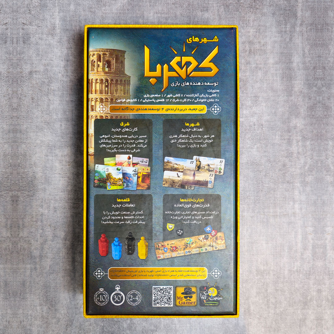 توسعه بازی کهربا (به تنهایی قابل بازی نیست) توسعهی Cities of Splendor برای بازی فکری Splendor، مجموعهای از یک بستهی الحاقی چهارگانه است که برای نسخهی اصلی بازی طراحی شده است. هر کدام از این بستهها باید به صورت جداگانه مورد استفاده قرار بگیرند. در بستهی «The Cities»، نشان ملاقات با افراد مشهور، با سه شهر جایگزین میشود (که این سه شهر به طور اتفاقی از میان ۱۴ شهر موجود انتخاب شدهاند). در این توسعه از بازی رومیزی اسپلندور، برخلاف نسخهی اصلی، به دست آوردن شهرها گزینهای دلخواه نبوده، و تبدیل به هدف بازی (در کسب امتیاز پرستیژ و کارتهای پیشرفت) شده است. در نتیجه، برای پیروزی در بازی باید حداقل به یکی از آنها دست پیدا کنید. در بستهی «The Trading Posts»، جایزههایی برای به دست آوردن مجموعهای خاص از کارتهای پیشرفت، به شما تعلق میگیرد. امتیاز پرستیژ بیشتر برای اولین ملاقات با افراد مشهور، یک سنگ قیمتی بیشتر برای زمانی که دو سنگ همرنگ انتخاب کردهاید، و غیره. در بستهی «The Orient»، سه دسته کارت جدید (که هر کدام مربوط به یکی از درجات کارتهای پیشرفت است) به بازی اضافه میشود. این دستهها در سمت راست کارتهای معمولی قرار گرفته، و از هر کدام دو کارت رو میشود. این کارتها، دارای قدرتهایی ویژه مانند دو برابر کردن امتیاز جایزه هستند. همچنین، در میان آنها کارتهای ژوکر وجود دارد، که میتوان برای خرید کارت پیشرفت، آنها را با هر رنگ دلخواهی در نظر گرفت. در بستهی «The Strongholds»، به هر کدام از بازیکنان سه برج داده میشود. زمانی که کارت جدیدی دریافت میکنید، باید یکی از برجهایتان را روی یکی از کارتهای روی میز قرار دهید. با این کار، شما تنها بازیکنی خواهید بود که توانایی خرید یا رزرو این کارت را خواهد داشت. همچنین، در نوبت خود میتوانید یکی از برجهایتان را از کارتی به کارت دیگر منتقل کرده، یا یکی از برجهای دیگر بازیکنان را از کارتی که روی آن قرار دارد، بردارید. هرگاه هر سه برج شما روی یک کارت باشد، میتوانید علاوه بر انجام نوبت خود، آن کارت را نیز خریداری کنید. این کار به شما اجازه میدهد که در یک نوبت دو کارت دریافت کنید، و یا پس از به حد نصاب رسیدن سنگهایتان، برای خرید کارت اقدام کنید. توسعهی «شهرهای اسپلندور» از بوردگیم اسپلندور، از جمله بازیهای سبک خانوادگی (Family) و استراتژیک (Strategic) است. از جمله مکانیزمهای این Board Game، میتوان به Card Drafting و Set Collection اشاره کرد.