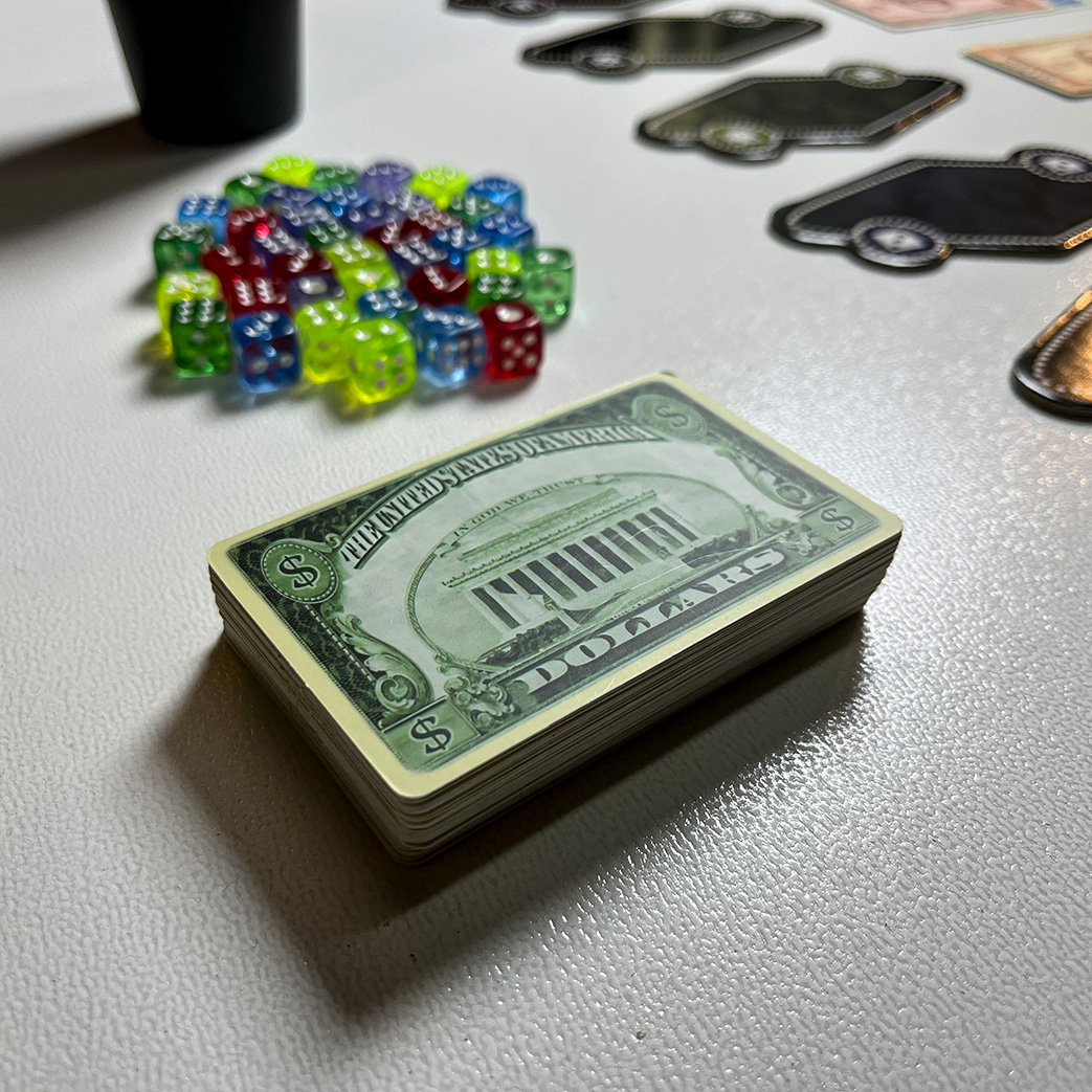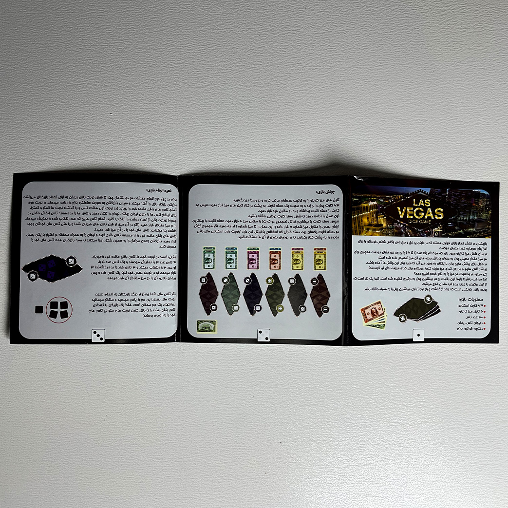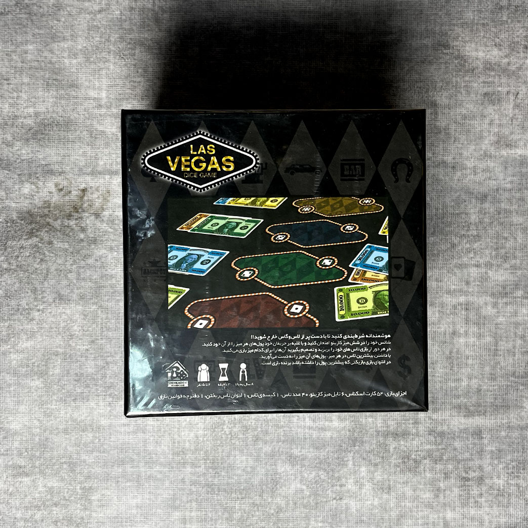 بازی فکری لاس وگاس هوشمندانه شرط بندی کنید تا با دست پر از لاس وگاس خارج شوید . شانس خود را در شش میز کازینو امتحان کنید و با غلبه بر حریفان خود پول های هر میز را از آن خود کنید. داستان بازی فکری لاس وگاس : بازیکنان در نقش قماربازان قهاری هستند که در دنیای پر زرق و برق لاس وگاس شانس خودشان را برای افزایش سرمایه خود امتحان میکنند . در هر دور از بازی تاس های خود را بریزید و تصمیم بگیرید آنها را برای کدام میز بازی می کنید. با داشتن بیشترین تاس در هر میز، پول های آن میز را بدست می آورید. در انتهای بازی بازیکنی که بیشترین پول را داشته باشد، برنده بازی است. اما مراقب باشید! بارها این رقابت بر سر بیشترین پول به درگیری کشیده شده است، تنها یک نفر است که از این درگیری با جیب پر و لب خندان خارج میشود. برنده بازی کسی است که بعد از گذشت چهار دور از بازی، بیشترین پول را به همراه داشته باشد. مشخصات و محتویات بازی فکری لاس وگاس : این بازی فکری جذاب برای 2 تا 5 بازیکن است و مناسب رده سنی +8 سال و مدت زمان برای انجام این بازی حدود 30 دقیقه است. 54 کارت اسکناس 6 تایل میز 40 عدد تاس 1 کیس تاس 1 لیوان برای تاس ریختن دفترچه قوانین بازی نحوه چینش بازی : تایلهای میز را به ترتیب عددشان مرتب کرده و در وسط میز بگذارید. 54 کارت پول را بر زده و به صورت یک دسته کارت، به پشت در کنار تایلهای میز قرار دهید; سپس دو کارت از دسته کارت برداشته و به رو مقابل خود قرار دهید. این عمل را ادامه دهید تا شش دسته کارت دوتایی داشته باشید. سپس دسته کارت با بیشترین ارزش ( مجموع دو کارت) را مقابل میز 6 قرار دهید. دسته کارت با بیشترین ارزش بعدی را مقابل میز شماره 5 قرار داده و این عمل را تا میز شماره 1 ادامه دهید. اگر مجموع ارزش دو دسته کارت یکسان بود، دسته کارتی که اسکناس با ارزشتری دارد اولویت دارد. اسکناسهای باقی مانده را به پشت به کنار بگذارید تا در دورهای بعدی از آنها استفاده کنید. نحوه انجام بازی : بازی در چهار دور انجام میشود، هر دور شامل چهار تا شش نوبت تاس ریختن به ازای تعداد بازیکنان میشود. بازیکن بزرگتر بازی را آغاز میکند و سپس بازیکنان به صورت ساعتگرد بازی را ادامه میدهد. در نوبت خود، تمام تاسهای باقیمانده خود را بریزد ( در نوبت اول هشت تاس و با گذست نوبتها کمتر و کمتر). برای اینکار تاسها را درون لیوان ریخته، لیوان را تکان دهید و تاسهایی که عدد انتخاب شده را نمایش میدهند را میز متناظر قرار دهید ( اگر در آن میز، از قبل تاسهای حریفان شام و یا حتی تاسهای خودتان وجود داشت باز میتوانید تاسهای خود را در آن میز قرار دهید). تاسهای باقی مانده خود را از محفظه تاس خارج کرده و لیوان را به همراه محفظه در اختیار بازیکن بعدی قرار دهید. بازیکنان بعدی مراحل را به همین شکل اجرا میکنند تا همه بازیکنان همه تاسهای خود را مصرف کنند.