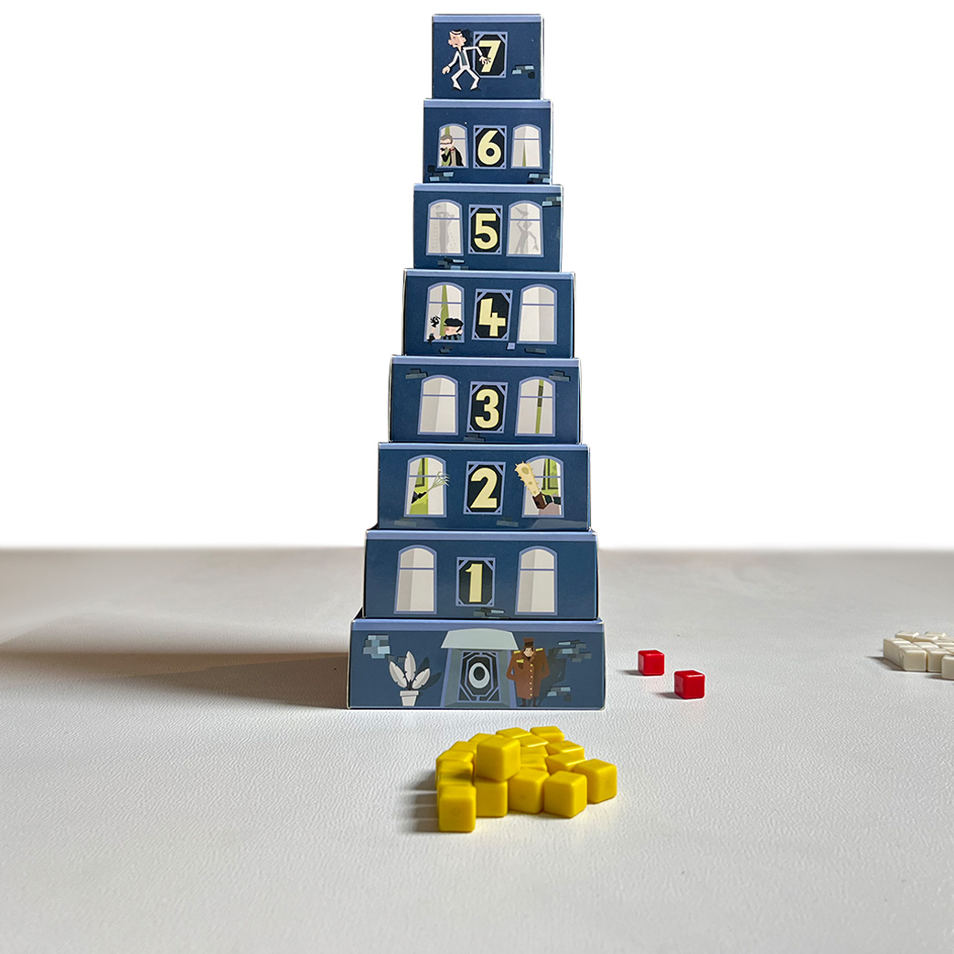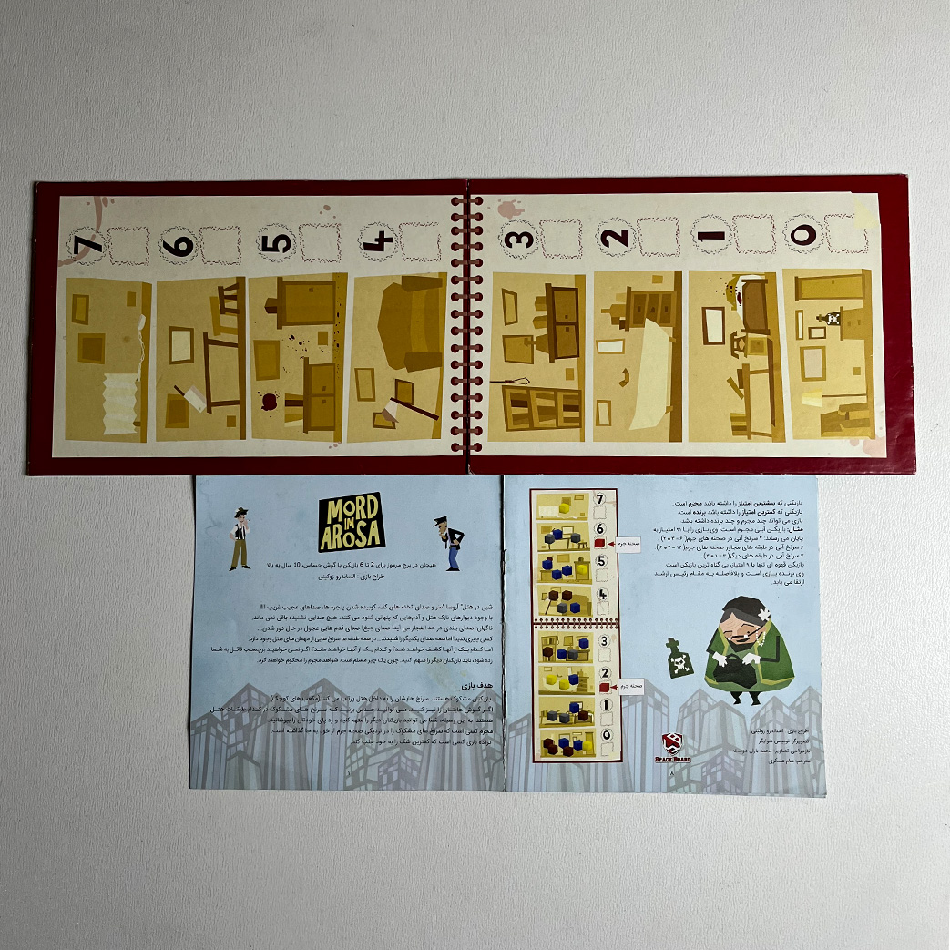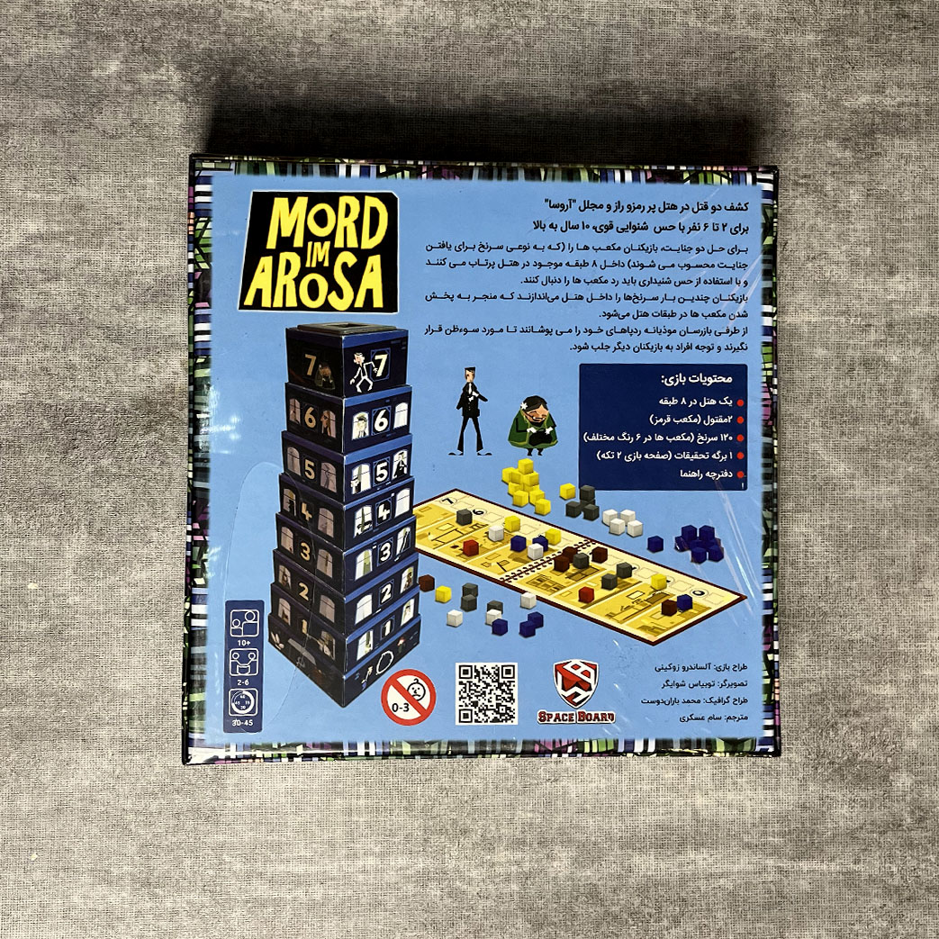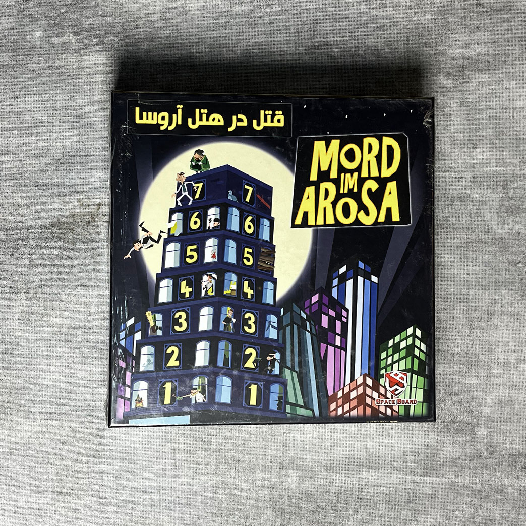 بازی قتل در هتل آروسا - برگردانی از بازی خارجی Mord im Arosa - مکانیزم و گیم پلی متفاوت و خاص - برای انجام این بازی حافظه قوی و گوش حساس نیاز است! - هیجان در برج مرموز برای 2 تا 6 بازیکن با گوش حساس! - کدام بازیکن مجرم است؟! و قاتل مخوف هتل معروف آروسا؟! - مناسب 2 الی 6 بازیکن - کیفیت بالای ساخت - محصولی از گروه اسپیس برد هیجان در برج مرموز برای 2 تا 6 بازیکن با گوش حساس، 10 سال به بالا طراح بازی : الساندرو زوکینی شبی در هتل" آروسا" سر و صدای تخته های کف، کوبیده شدن پنجره ها، صداهای عجیب غریب !!! با وجود دیوارهای نازک هتل و آدم هایی که پنهانی شنود می کنند، هیچ صدایی نشنیده باقی نمی ماند. ناگهان: صدای بلندی در حد انفجار می آید! صدای جیغ! صدای قدم هایی عجول در حال دور شدن... کسی چیزی ندید! اما همه صدای یکدیگر را شنیدند...در همه طبقه ها سرنخ هایی از مهمان های هتل وجود دارد. اما کدام یک از آنها کشف خواهد شد؟ و کدام یک از آنها خواهد ماند؟اگر نمی خواهید برچسب قاتل به شما زده شود، باید بازیکنان دیگر را متهم کنید.چون یک چیز مسلم است: شواهد مجرم را محکوم خواهند کرد. هدف بازی بازیکنان مشکوک هستند.سرنخ هایشان را به داخل هتل پرتاب می کنند(مکعب های کوچک). اگر گوش هایتان را تیز کنید، می توانید حدس بزنید که سرنخ های مشکوک در کدام طبقات هتل هستند. به این وسیله، شما می توانید بازیکنان دیگر را متهم کنید و رد پای خودتان را بپوشانید.مجرم کسی است که سرنخ های مشکوک را در نزدیکی صحنه جرم از خود به جا گذاشته است. برنده بازی کسی است که کمترین شک را به خود جلب کند. اجزای بازی 1 هتل 8 طبقه 2مقتول (مکعب قرمز) 120 سرنخ(مکعب ها در 6 رنگ مختلف) 1 برگه تحقیقات ( صفحه بازی 2تکه) دفترچه راهنما 7طبقه را بر روی طبقه همکف(طبقه صفر) بچینید تا ساختمان هتل ساخته شود. برگه تحقیقات را کنار هتل بگذارید. هر بازیکن ۲۰ سرنخ از رنگ خود را به عنوان "منبع" جلوی خود قرار میدهد. سرآغاز: 2جنازه در "هتل آروسا" - و سرنخ ها در همه جا... بازیکنی که آخرین بار چاقو دستش بوده،2 مقتول(مکعب قرمز) را از حفره بالا، به داخل هتل می اندازد.پس از آن، هر بازیکن در نوبت خودش، 2سرنخ از رنگ خودش را از حفره بالا، به داخل هتل می اندازد. توجه: همه بازیکنان باید به دقت گوش کنند که مقتول ها و سرنخ ها در کدام طبقه های هتل ممکن است افتاده باشند. بازی اصلی:تحقیق جریان بازی بازی اصلی به 2 بخش تقسیم می شود:پس از این که 2مقتول در بخش 1 پیدا شدند، بخش 2 آغاز می شود. بازیکنان به هم مشکوک هستند و تلاش می کنند تا رد پای خودشان را بپوشانند.