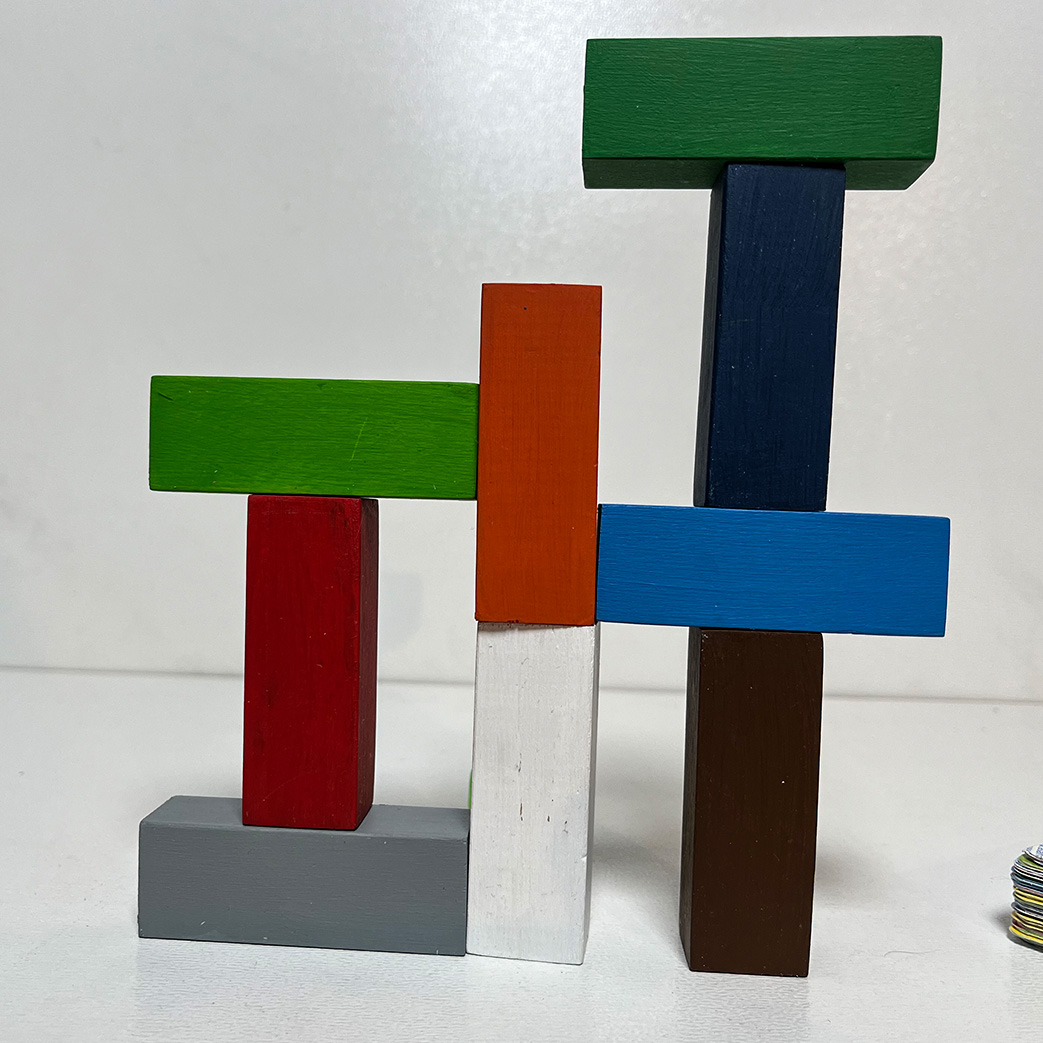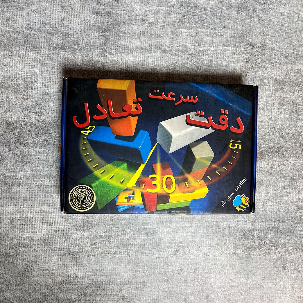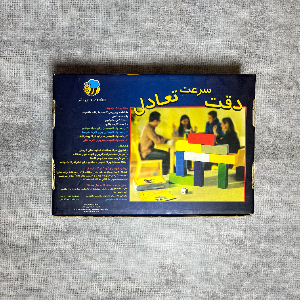 بازي فکري ازجمله بازيهايي بوده که ذهن افراد را به چالش کشيده و باعث افزايش قدرت کودکان در حل مسئله، خلاقيت، رشد ذهني، کسب مهارت ارتباطي و... ميشود. بازي فکري دقت سرعت تعادل ازجمله بازيهايي است که افراد را به انجام کار گروهي تشويق ميکند و باعث افزايش دقت، تمرکز و سرعت در انجام کارها ميشود. اين مجموعه شامل 10 قطعه چوبي بزرگ در 10 رنگ متفاوت، يک عدد تاس، 4 عدد کارت توضيح و 60 عدد کارت بازي در چهار رنگ مختلف است. اين بازي مناسب براي کودکان بالاي 2 سال بوده و تعداد بازيکنان اين مجموعه بايد 2 تا 4 نفر باشد. در اين مجموعه روش بازي براي کودکان 2 تا 8 سال و 8 سال به بالا ارائه شده است. کودکان 2 سال به بالا در ابتدا بدون استفاده از کارتها فقط مهارتهاي در دست گرفتن، روي هم چيدن و شناخت رنگها را آموزش ميبينند. اين قطعات چوبي به شکلي ساخته شدهاند که هيچگونه خطري براي کودکان ندارند. از سن 4 سال به بالا کودک ميتواند از کارتهايي که حاشيه سبز دارند، استفاده کند. افراد بالاي 8 سال بايد تصاوير کارتها را در زمان خاص بسازند و بازيکني که امتياز بيشتري به دست بياورد، برنده بازي است.