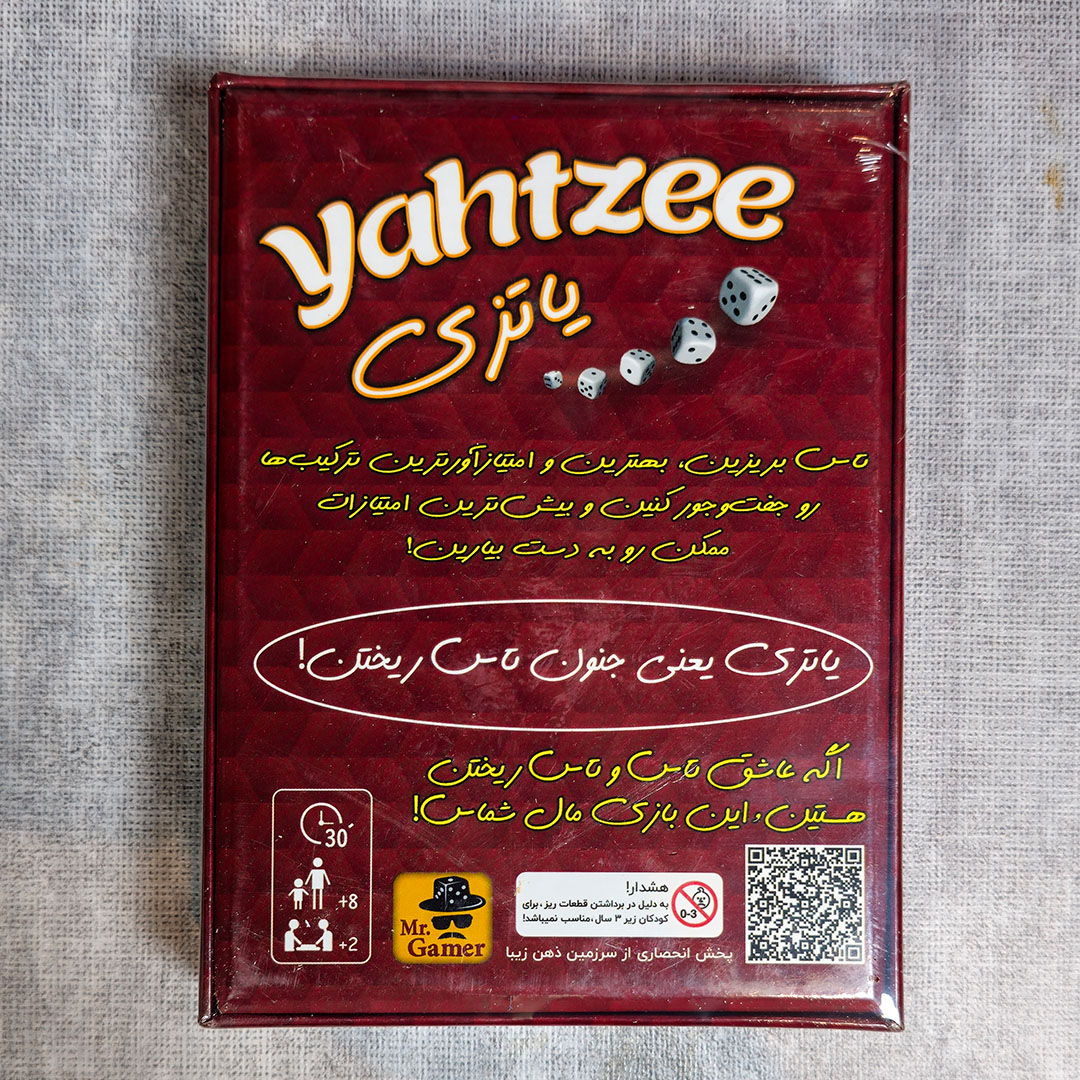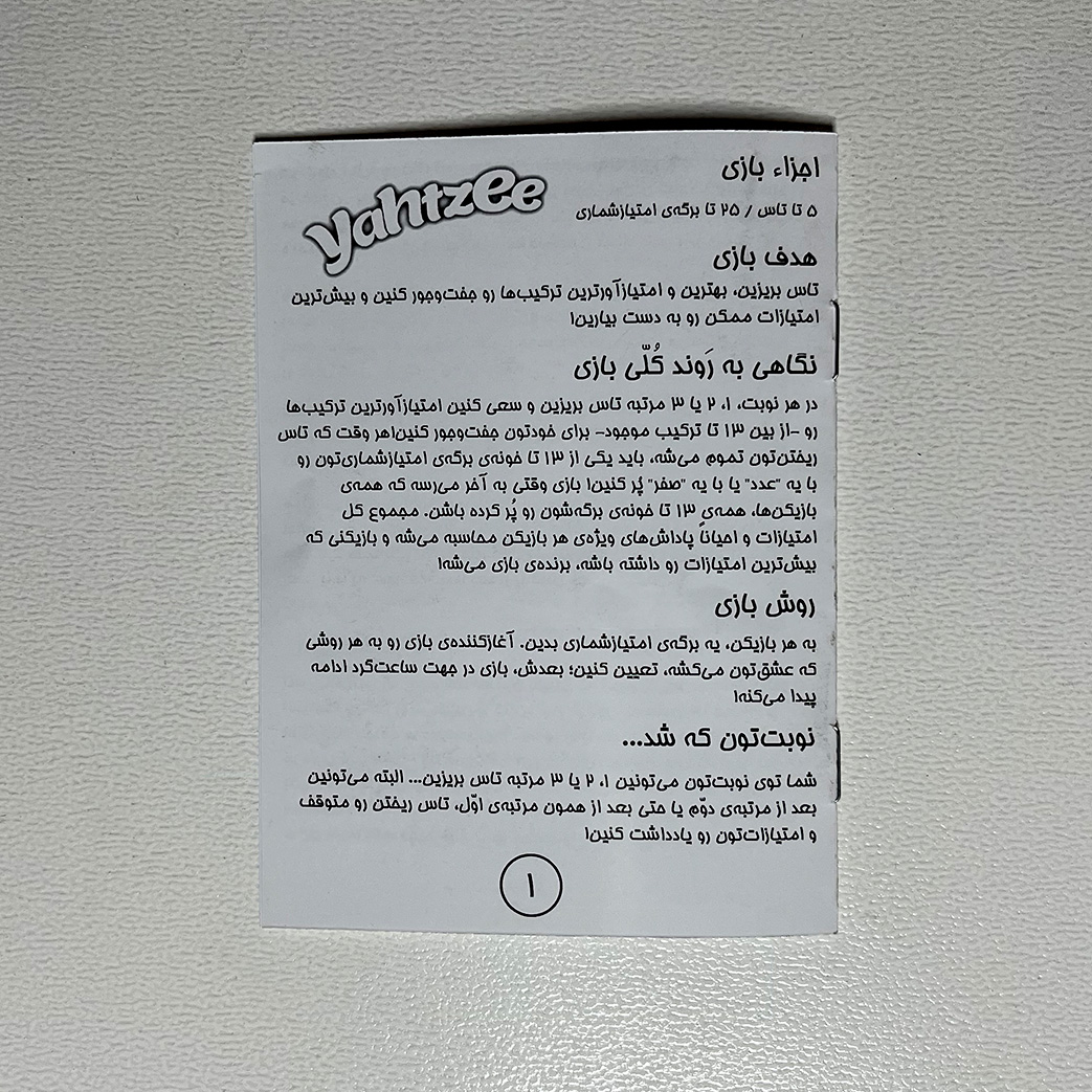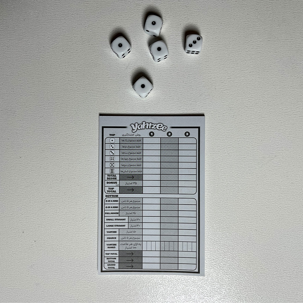 هدف بازی تاس بریزین، بهترین و امتیازآورترین ترکیبها رو جفتوجور کنین و بیشترین امتیازات ممکن رو به دست بیارین! نگاهی به رَوند کُلّی بازی در هر نوبت، 1، 2 یا 3 مرتبه تاس بریزین و سعی کنین امتیازآورترین ترکیبها رو -از بین 13 ترکیب موجود- برای خودتون جفتوجور کنین! هر وقت که تاس ریختنتون تموم میشه، باید یکی از 13 تا خونهی برگهی امتیازشماریتون رو با یه "عدد" یا با یه "صفر" پُر کنین! بازی وقتی به آخر میرسه که همهی بازیکنها، همهی 13 خونهی برگهشون رو پُر کرده باشن. مجموعِ کُلّ امتیازات و احیاناً پاداشهای ویژهی هر بازیکن محاسبه میشه و بازیکنی که بیشترین امتیازات رو داشته باشه، برندهی بازی میشه!