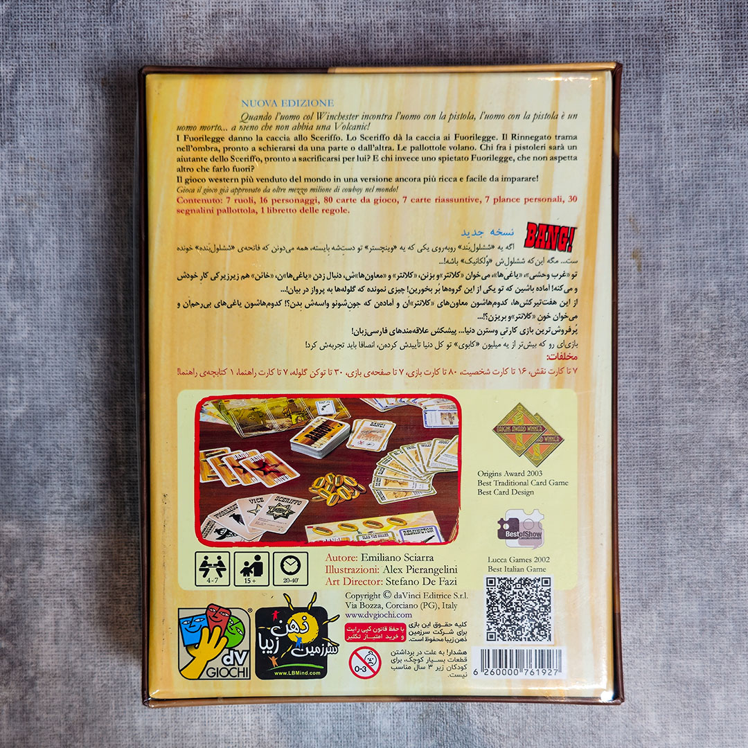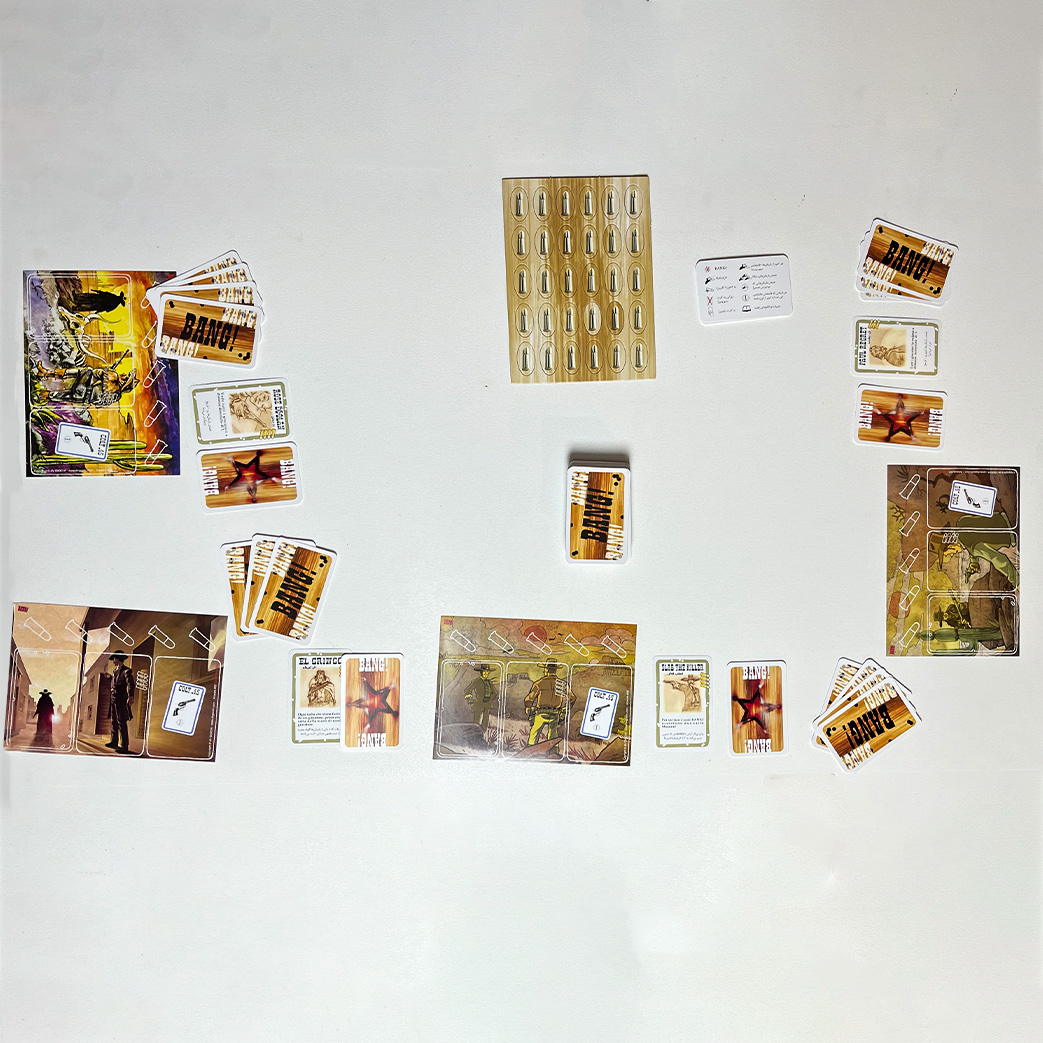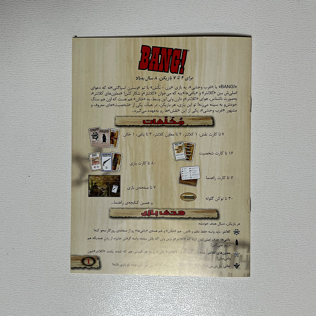 اگه یه ششلول بند رو به روی یکی که یه وینچستر تو دست شه بایسته، همه می دونن که فاتحه ششلول بنده خونده است... مگه این که ششلول اش ولکانیک باشه... تو غرب وحشی، یاغی ها می خوان کلانتر رو بزنن، کلانتر و معاون هاش، دنبال زدن یاغی ها هستند، خائن هم زیرزیرکی کار خودش رو می کنه! آماده باشین که تو یکی از این گروه ها بر بخورین! چیزی نمونده که گلوله ها به پرواز در بیان! از این هفت تیرکش ها، کدوم هاشون معاون های کلانتر هستند و آماده هستند که جونشون رو واسه اش بدن؟! کدوم هاشون یاغی های بی رحم هستند و می خوان خون کلانتر رو بریزن؟! پر فروش ترین بازی کارتی وسترن دنیا... پیشکش به تمام علاقه مندان فارسی زبان! محتویات: 7 تا کارت نقش، 16 تا کارت شخصیت، 80 تا کارت بازی، 7 تا صفحه بازی، 30 تا توکن گلوله، 7 تا کارت راهنما، 1 کتابچه راهنما