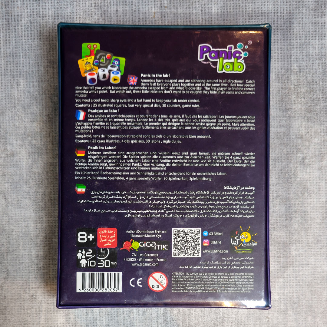 یه آزمایشگاه مخوف و ترسناک در یه مکان نامعلوم و مخفی برای آزمایش روی جانوارن تک سلولی به نام آمیب!!! آمیب ها موجوداتی که بی شباهت به بیگانگان فضایی نیستند! و در آزمایشگاهی به نامpanic lab مورد بررسی و اکتشاف قرار گرفتند. البته این موجودات فوق العاده جذاب و زیبا به هیچ وجه خطرناک نیستند و آزاری برای انسان ها ندارند، البته این موضوعی هست که هنوز به طور کامل اثبات نشده و دانشمندان در پنیک لب برای اثبات این موضوع تلاش میکنند! اما شاید بپرسید مشکل کار کجاست و این تحقیقات به ما چه ارتباطی میتونه داشته باشه؟؟! نکته همینجاست!!! تعدادی از این آمیب ها از آزمایشگاه فرار کردند، البته خوشبختانه هنوز در همین مرکز هستند و از محیط کلی آزمایشگاه بیرون نرفتند. دانشمندان از شما برای پیدا کردن اونها درخواست کمک کردند و شما باید هر چه سریعتر اونها رو به آزمایشگاه برگردونید! آمیب ها علاقه خاصی به جاهای تاریک و کوچک دارند و شما از این محیط ها غافل نشید، بخصوص کانال های کولر!! از یک ویژگی منحصر به فرد، آمیب ها بهره میبرند و اون تغییر شکل، رنگ و طرح هست!! درست شنیدید، آمیب ها میتونن به رنگ ها، شکل ها و طرح های مختلفی تغییر کنند و این میتونه کار شما رو برای پیدا کردنشون مشکل کنه! پس عجله کنید، چون وقت زیادی ندارید و سعی کنید آمیب های بیشتری رو در سریع ترین زمان ممکن در PANIC LAB پیدا کنید!!! پنیک لب یه بازی کارتی هست که علیرغم سادگی و کم بودن اجزاء اون خیلی جذاب و هیجانی هست. مکانیک این بازی پرتاب تاس، الگو شناسی و حافظه است و با ترکیب این مکانیک ها باعث ایجاد بازی شاد و خلاقی شده. آموزش و یادگیری قوانین این بازی خیلی کمتر و ساده تر از اون چیزی هست که شما فکر میکنید و به همین خاطر برای اکثر سنین، حتی کودکان بین 8 تا 10 سال قابل بازی است. بازی پنیک لب، کامپوننتس یا محتویات خیلی کمی داره و فقط از 25 کارت و 4 تاس تشکیل شده و در عین این سادگی بدلیل خلاقیت بالایی که داره قطعا باعث علاقه شما و دیگر بازیکنان میشه. تصاویر کشیده شده بر روی کارت های بازی فوق العاده جذاب و فان هستند و تصویرگر بازی با استفاده از رنگ های شاد و طرح های فان و زیبایی که از آمیب ها کشیده، باعث شده بازیکنان در هنگام بازی حس خوب و شادی رو تجربه کنن. شما در این بازی باید با توجه به علائم روی تاس های بازی که به صورت تصادفی نمایش داده میشوند، زودتر از سایر بازیکنان آمیب مورد نظر رو پیدا کنید و سرعت العمل و هماهنگی بین مغز و دستتون رو بسنجید. بازی پنیک لب کمک شایانی به ارتباط و هماهنگی دو نیمکره مغزتون میکنه و همچنین ارتباط مغز با اندام های حرکتی دست و همچنین چشمان شما میشه و شما با انجام بازی در دفعات زیاد میتونید این مهارت ها رو ارتقا ببخشید. از خصوصیات مثبت این بازی میشه به امکان بازی کردن با تعداد نفرات بالا و سنین مختلف اشاره کرد، همچنین به دلیل ساده بودن قوانین بازی، آموزش بازی خیلی سریع انجام میگیره و زمان کوتاه بازی میتونه از خسته شدن شما و سایر بازیکنان جلوگیری کنه. از مزیت های دیگه بازی پنیک لب امکان بازی به 2 روش ساده و پیشرفته است، شما میتونید ( با یا بدون ) کارت های کانال کولر و دگردیسی بازی رو انجام بدید و این موضوع بسته به سن بازیکنان و همچنین مهارت های اونها، برای بهتر شدن بازی کمک شایانی میکنه.