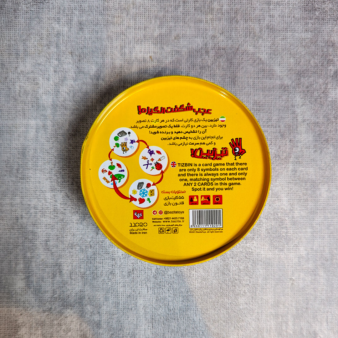 یزبین یک بازی کارتی است که در هر کارت 8 تصویر وجود دارد. بین هر دو کارت، فقط یک تصویر مشترک وجود دارد. بازیکنان باید با تیزبینی و سرعت عمل خود بین کارتهای بازی تصویر مشترک را بیابند و زودتر از بقیه نام آن تصویر را اعلام کنند. آن تصویر را تشخیص دهید و برنده شوید! برای انجام این بازی به چشم های تیزبین و کمی هم سرعت عمل نیاز دارید. جذابت این بازی در آن است که شما این بازی را می توانید به 5 روش مختلف انجام دهید. هدف این بازی افزایش تمرکز و سرعت عمل بازیکنان است.